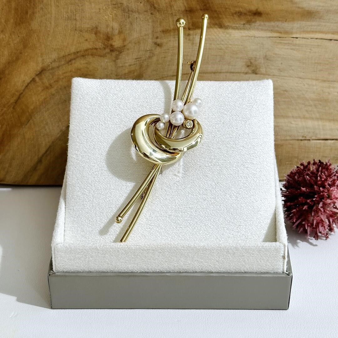 Diese Stabbrosche aus 585er Gelbgold beeindruckt durch ihr sanft geschwungenes Design und eine feine Kombination aus Perlenbesatz und Diamantakzent. Die zarten Perlen harmonieren mit dem warmen Goldton und unterstreichen die elegante Linienführung der Brosche. Ein kleiner, funkelnder Diamant verleiht dem Schmuckstück zusätzlich eine besondere Note. Durch ihre geschmeidige Form wirkt die Brosche weich und edel zugleich – ein stilvolles Accessoire, das sowohl zu festlichen als auch zu schlichten Outfits getragen werden kann. Ein zeitloses Stück für Liebhaberinnen klassischer Eleganz.