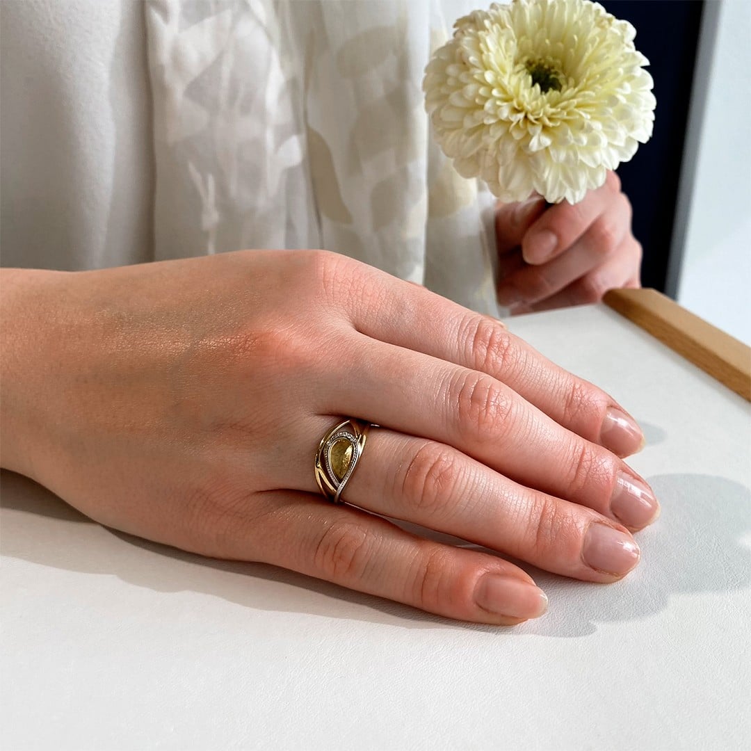 Dieser Diamantring ist aus 585 Gelb- und Weißgold gefertigt und mit funkelnden Diamanten besetzt. Das durchbrochene Design dieses Rings schafft eine feine und doch auffällige Struktur, die durch die Kombination von Gelb- und Weißgold eine harmonische Balance findet. Die feinen Diamanten setzen dabei glanzvolle Akzente. Die eismatte Oberfläche in der Mitte des Rings unterstreicht die Feinheit der Verarbeitung und verleiht dem Schmuckstück. Dieser Ring ist perfekt für diejenigen, die zarte Eleganz schätzen und auf der Suche nach einem zeitlosen Schmuckstück sind. Kombinieren Sie dazu weitere Schmuckstücke aus unserem Sortiment.