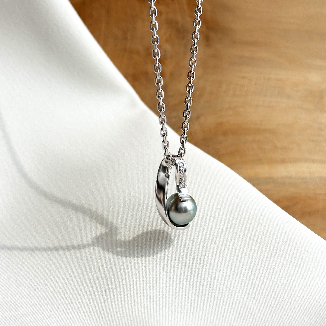 Dieser elegante Anhänger aus 585er Weißgold vereint zeitlose Linienführung mit edlen Materialien. Im Mittelpunkt steht eine schimmernde Tahitiperle, die von einer geschwungenen Fassung gehalten wird. Der sanfte Glanz der Perle wird durch die kühle Klarheit des Weißgoldes unterstrichen. In der Schlaufe, die sich schwungvoll über die Perle legt, sind drei kleine Brillanten eingefasst, die für ein dezentes Funkeln sorgen und den Anhänger zusätzlich veredeln. Die harmonische Kombination aus Perle, Brillanten und Weißgold macht dieses Schmuckstück zu einer stilvollen Wahl – sowohl für den Alltag als auch für festliche Anlässe.