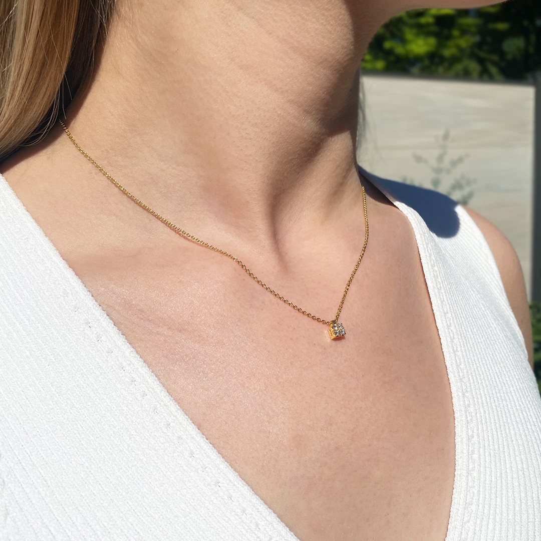 Dieser Brillantanhänger aus 750er Gelbgold ist fix auf einer feinen Goldkette montiert und überzeugt durch seine raffinierte Gestaltung. Vier präzise gefasste Brillanten erzeugen durch ihre Anordnung die optische Wirkung eines einzigen größeren Steins – ein stilvolles Detail mit besonderem Ausdruck. Das Collier strahlt zeitlose Zurückhaltung aus und eignet sich hervorragend als Geschenk zu bedeutenden Anlässen wie Geburtstagen oder Jubiläen. Passende Brillantohrringe zur Ergänzung der Schmuckgarnitur finden Sie ebenfalls in unserem Sortiment. Ein dezentes Schmuckstück mit bleibendem Charakter.