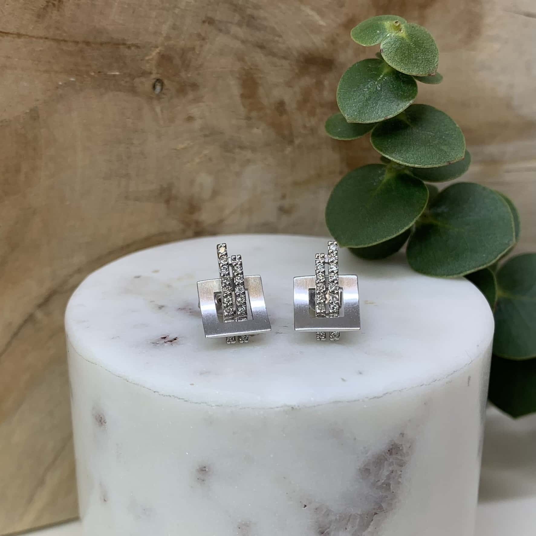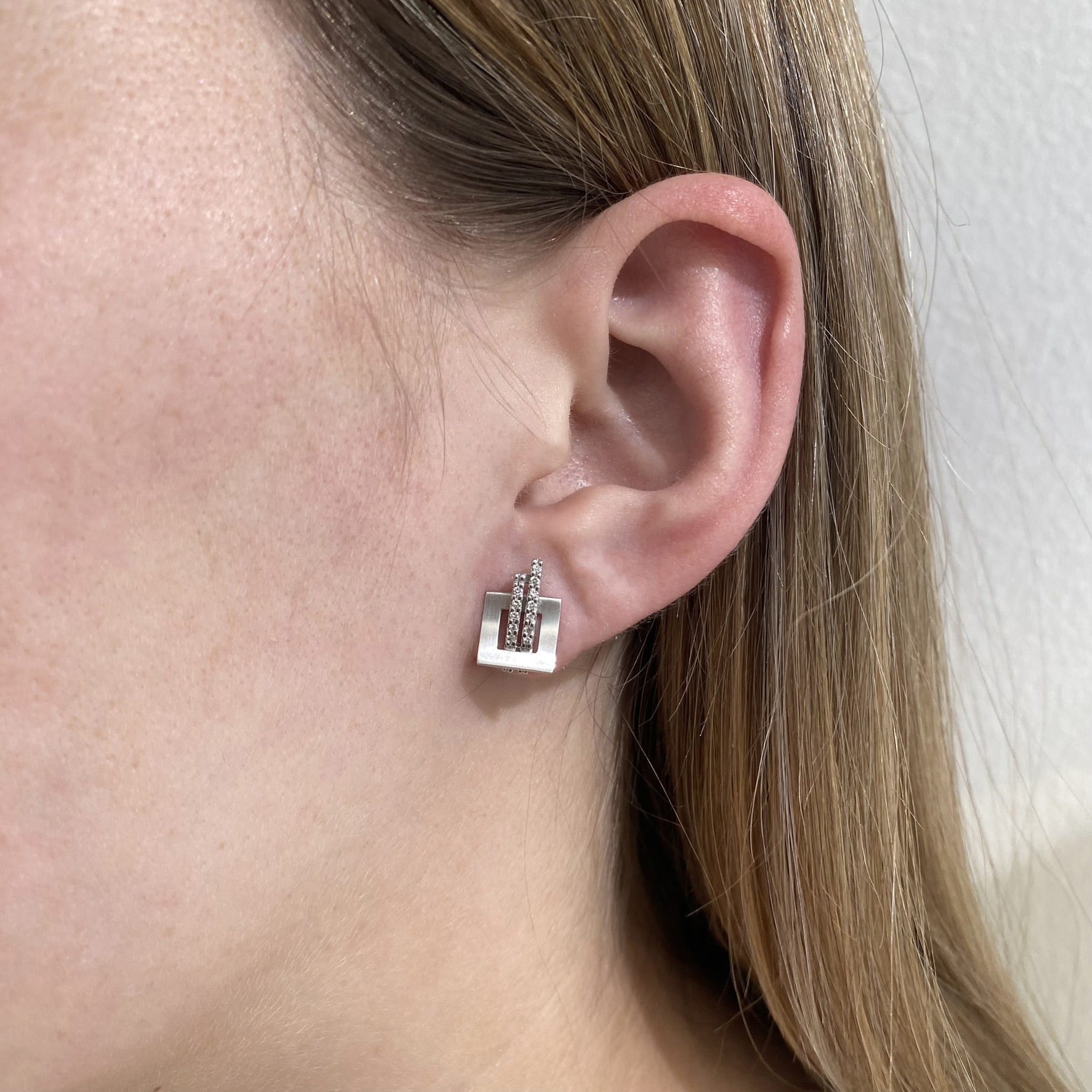 Diese Brillantohrstecker aus 585 Weißgold bestechen durch ihr klares, modernes Design. Die eckige Form wird durch zwei funkelnde Linien aus Brillanten raffiniert durchbrochen, was dem Schmuckstück eine besondere Tiefe und Eleganz verleiht. Die Diamanten strahlen mit feinem Glanz und setzen stilvolle Akzente, ohne sich in den Vordergrund zu drängen. Ob zu schlichten Outfits oder eleganter Garderobe – diese Ohrstecker verleihen jedem Look eine edle, zeitlose Note und sind ein dezenter Blickfang mit besonderem Charakter.