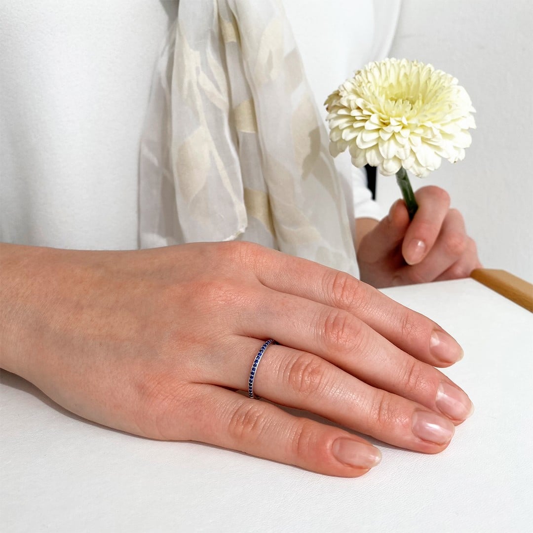 Dieser Ring aus 585 Weißgold ist mit insgesamt 0,16ct Saphiren halb ausgefasst und verbindet klassisches Design mit moderner Zurückhaltung. Die intensiv blauen Edelsteine kommen auf dem kühlen Weißgold besonders schön zur Geltung und verleihen dem Ring eine zeitlose Ausstrahlung. Die leicht gewölbte Ringschiene sorgt für angenehmen Tragekomfort und macht ihn zu einem idealen Begleiter – sowohl solo getragen als auch in Kombination mit anderen Ringen. Durch seine schlichte Eleganz passt er sich unterschiedlichsten Stilrichtungen an und setzt dabei immer einen feinen, farbigen Akzent. Der Ring ist in der Weite 54 vorrätig.