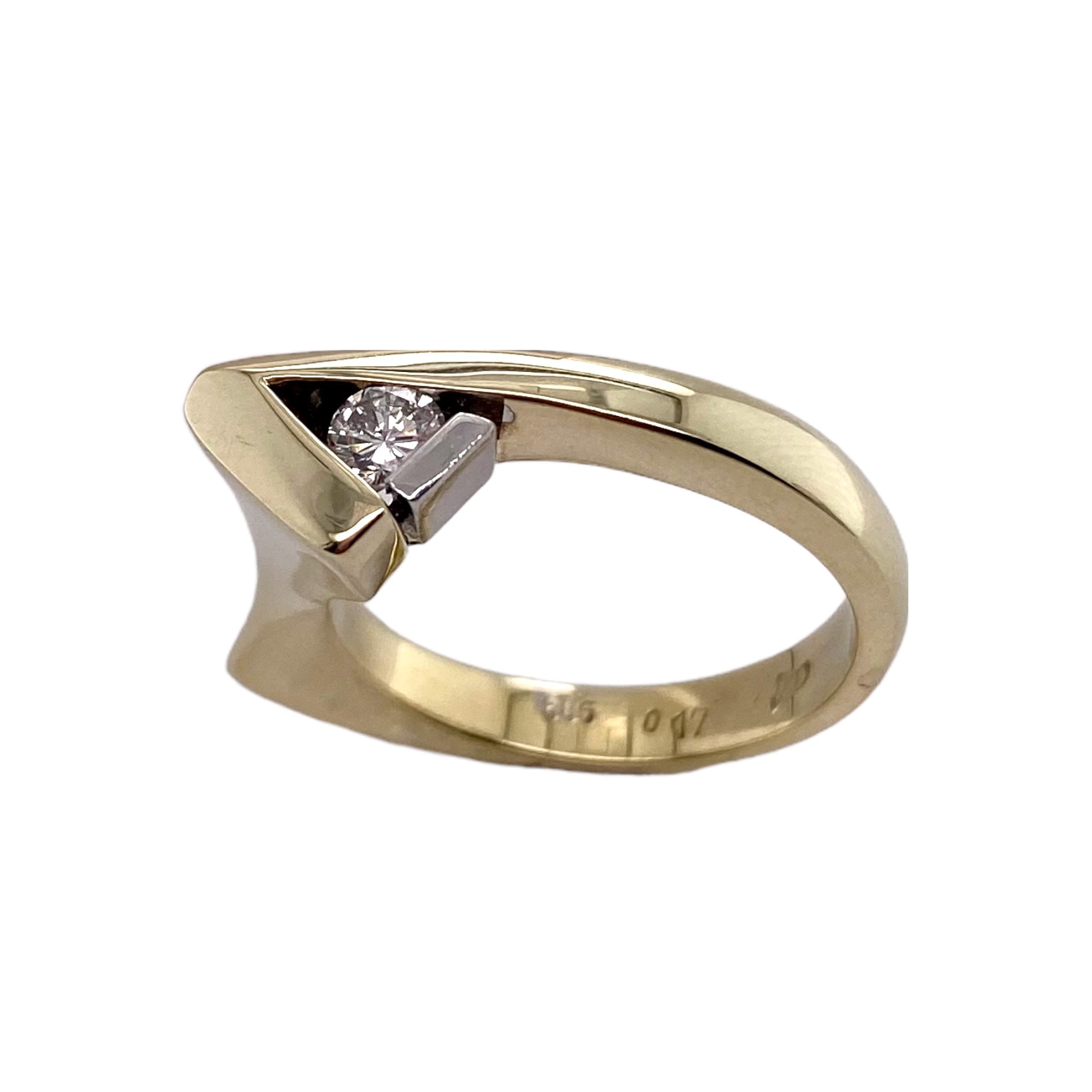 Dieser Ring aus 585 Gelb- und Weißgold besticht durch sein modernes, asymmetrisches Design. Die Form ist nicht klassisch rund, sondern seitlich sanft geschwungen und geradlinig gearbeitet – das verleiht dem Ring eine markante, besondere Ausstrahlung. Ein Brillant mit 0,17ct. bildet den funkelnden Mittelpunkt und wird von der spannenden Linienführung harmonisch eingefasst. Trotz seiner auffälligen Form trägt sich der Ring sehr angenehm und passt sich der natürlichen Form des Fingers wunderbar an. Ein stilvolles Schmuckstück für alle, die Wert auf besondere Details legen. Der Ring ist in der Weite 55 erhältlich.