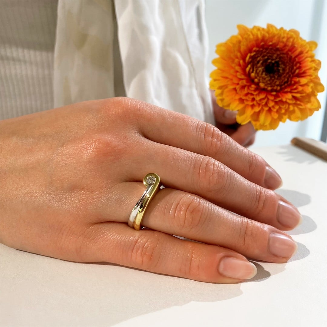 Dieser besondere Ring aus 585 Gelb- und Weißgold zieht durch seine außergewöhnliche Form sofort die Blicke auf sich. Statt einer klassischen Rundung ist der Ring seitlich leicht geschwungen und geradlinig gearbeitet – ein markantes Design, das dennoch durch weiche Übergänge überzeugt. Im Mittelpunkt sitzt ein funkelnder Brillant mit 0,17ct., der von der Form des Rings elegant eingerahmt wird. Trotz seiner auffälligen Optik liegt der Ring angenehm am Finger und schmiegt sich sanft an. Ein ausdrucksstarkes Schmuckstück für alle, die das Besondere schätzen. Der Ring ist in der Weite 55 lagernd.