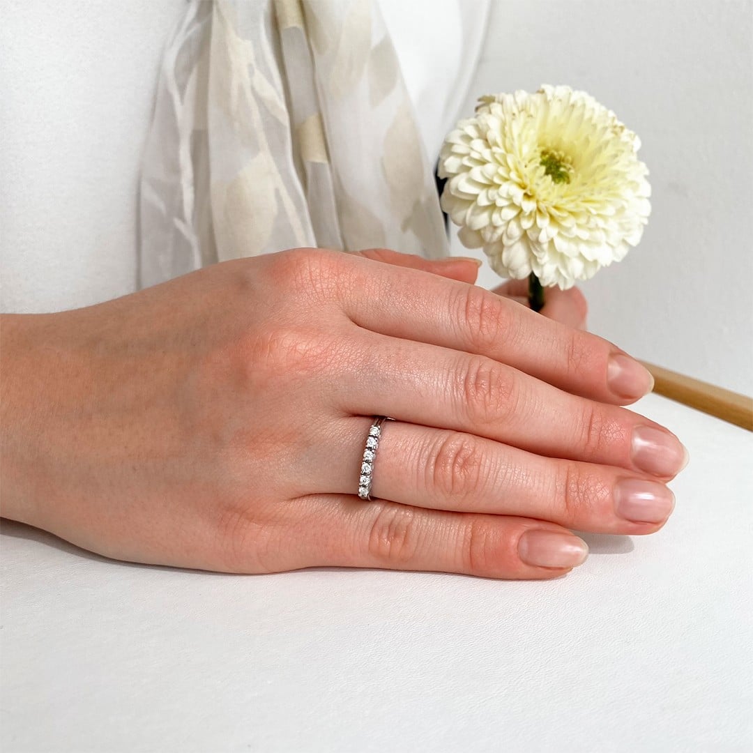 Dieser elegante Reihenring aus 585 Weißgold ist mit sechs funkelnden Brillanten besetzt, die in einer feinen Linie leicht erhaben gefasst sind. Das klare, stilvolle Design verleiht dem Ring eine edle Ausstrahlung und lässt die Brillanten wunderbar zur Geltung kommen. Ob einzeln getragen oder in Kombination mit einem klassischen Ehering oder einem schlichten Bandring – dieser Ring fügt sich harmonisch ein und sorgt für einen dezenten Glanzmoment. Ein vielseitiges Schmuckstück, das sich sowohl für den Alltag als auch für besondere Anlässe eignet und durch seine zeitlose Schönheit begeistert.