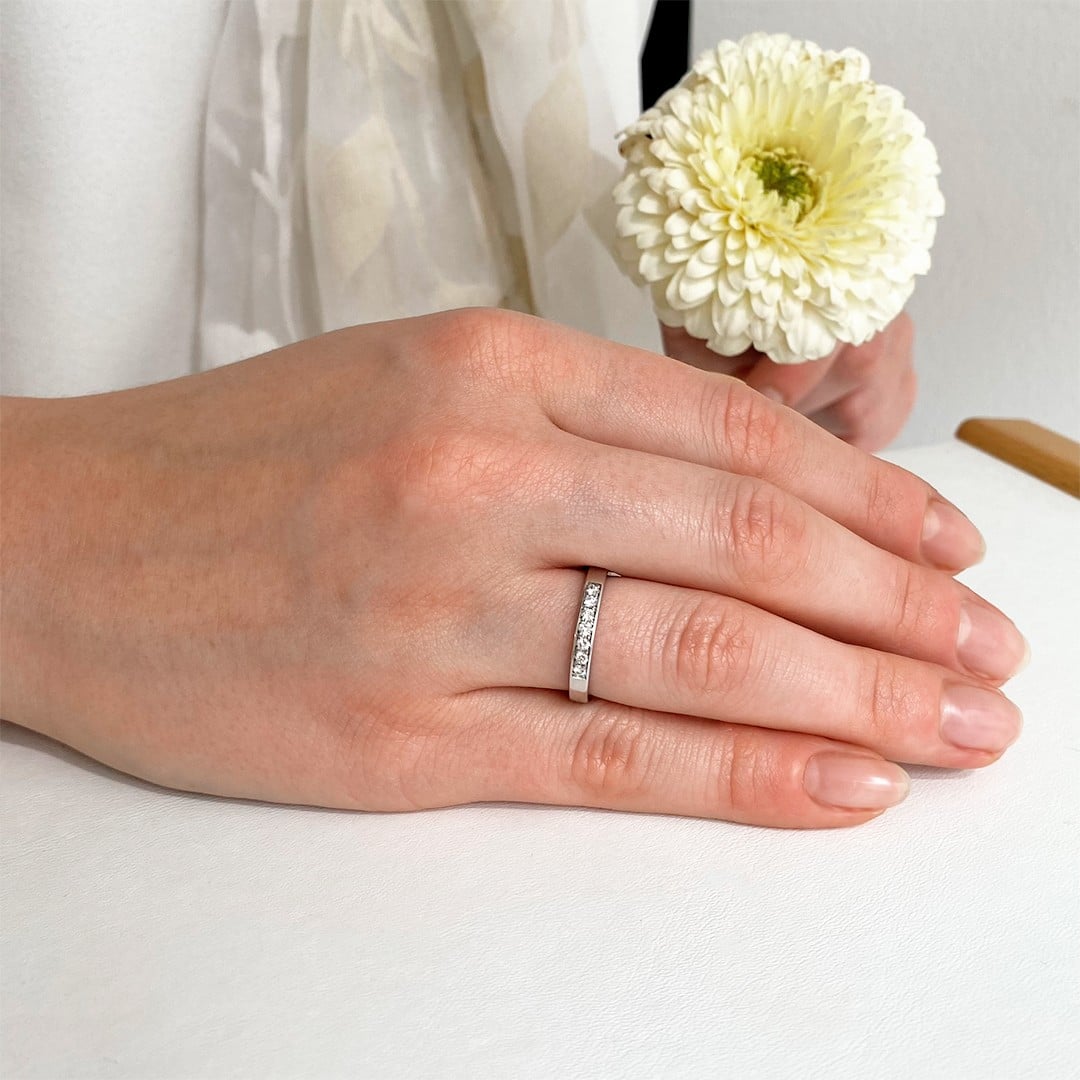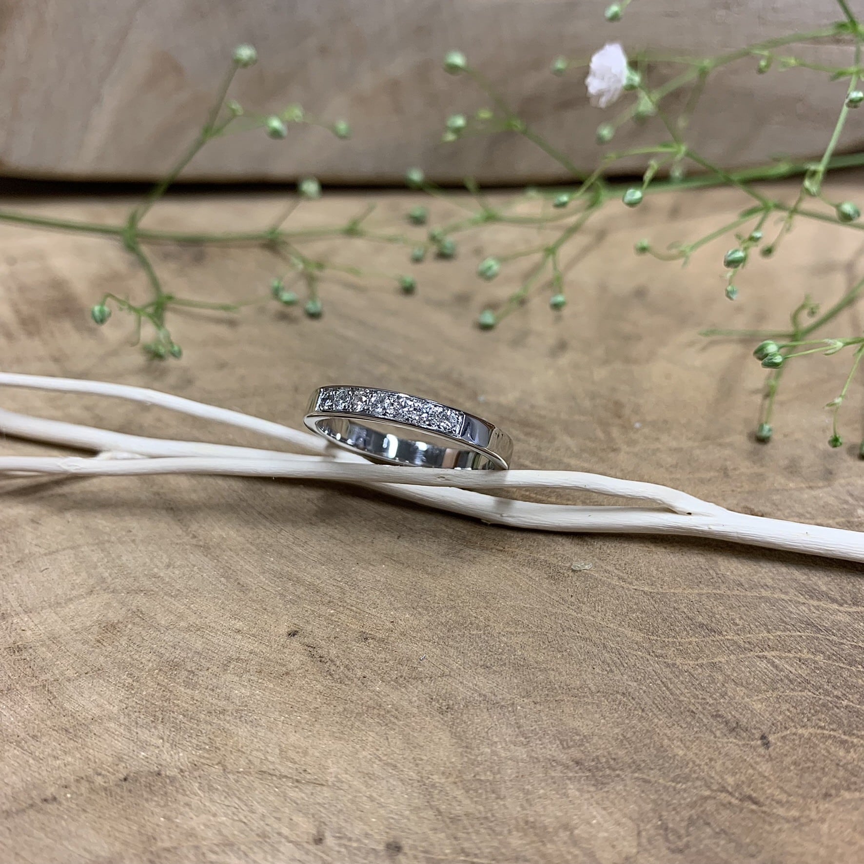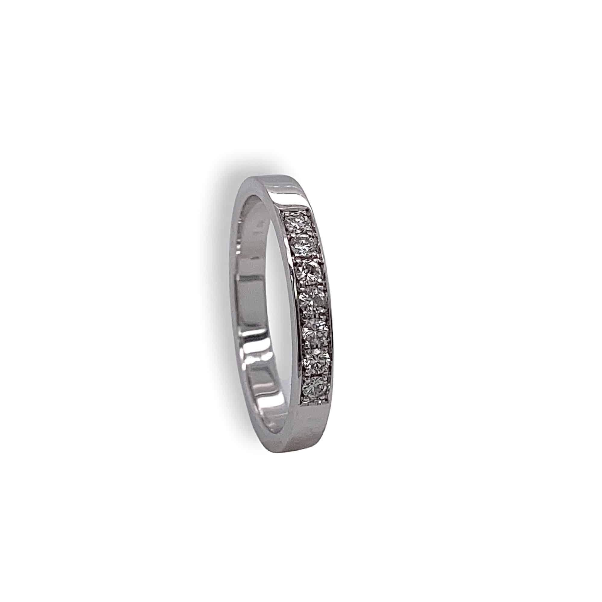 Dieser Diamantring aus 585er Weißgold ist mit sieben strahlenden Brillanten besetzt, die in feiner Reihe nebeneinander eingefasst sind. Die klare, gleichmäßige Anordnung verleiht dem Ring eine ausgewogene Eleganz, die sich dezent und doch wirkungsvoll zeigt. Ob als schlichter Ehering, liebevolles Geschenk oder stilvoller Alltagsbegleiter – dieses Schmuckstück überzeugt durch seine zeitlose Gestaltung und die klassische Verbindung von kühlem Weißgold und funkelnden Diamanten. Ein Ring, der jedem Moment eine besondere Note verleiht. In Ringweite 54 sofort erhältlich.