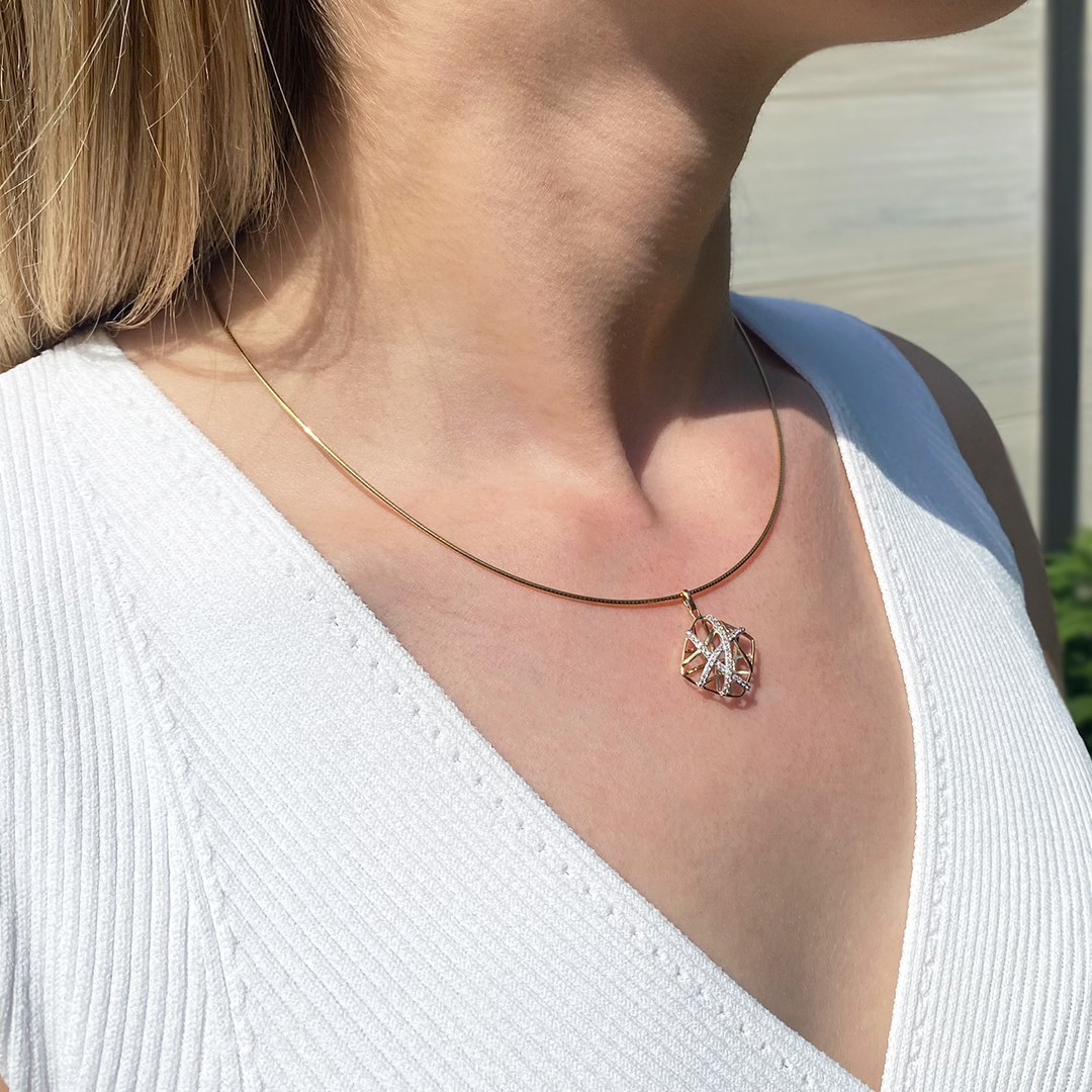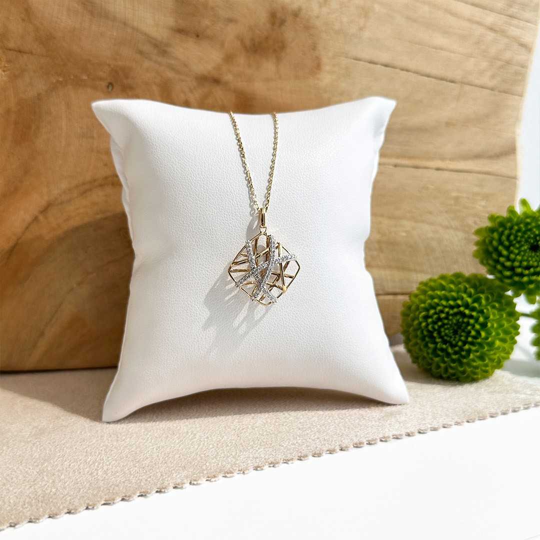 Dieser Brillantanhänger ist aus 585er Gelbgold gefertigt und mit insgesamt 0,24ct. Brillant besetzt. Das ästhetische, durchbrochene Design des Anhängers wirkt anziehend und sorgt für ein stilvolles Funkeln am Dekolleté. Tipp: Auch auf einem Omega Halsreif kommt der Brillantanhänger besonders schön zur Geltung. Für alle, die es lieber schlichter mögen, bieten wir zarte Standard-Goldketten.