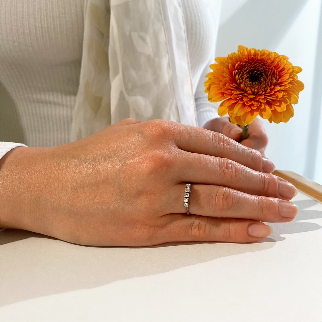 Dieser elegante Reihenring aus 585 Weißgold ist mit fünf funkelnden Brillanten besetzt, die im Weißgold besonders schön zur Geltung kommen. Die Brillanten sind aneinandergereiht gefasst und haben insgesamt ein Gewicht von 0,25ct. Der Ring kann entweder alleine oder in Kombination mit anderen Ringen getragen werden und verleiht jedem Outfit eine elegante Note. Das zeitlose Design des Rings macht ihn zu einem Schmuckstück, das Sie immer wieder gerne tragen werden. Der Ring ist eine wunderbare Geschenkidee für einen besonderen Anlass oder um sich selbst zu verwöhnen. Der Ring ist in der Weite 56 lagernd.