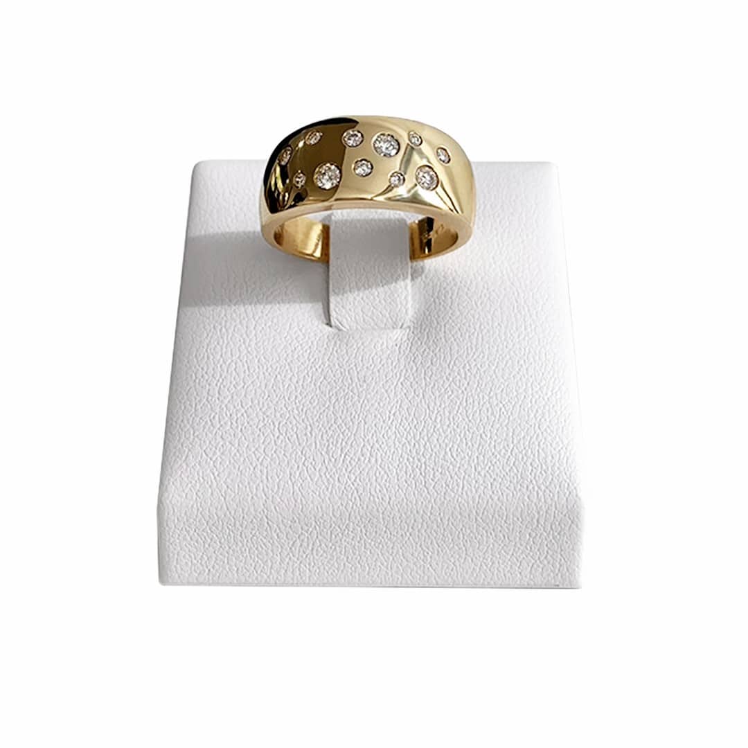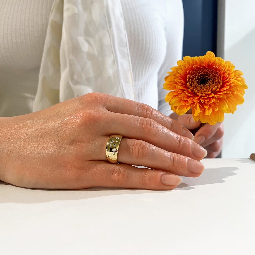 Dieser Ring aus 585 Gelbgold besticht durch sein modernes, ausdrucksstarkes Design. Mit einer Breite von 8mm an der Oberseite bietet er Platz für elf funkelnde Brillanten, die in unterschiedlichen Größen und wie zufällig verteilt eingefasst sind – fast wie kleine Lichtpunkte, die sich über die glänzende Oberfläche verteilen. Die polierte Oberfläche verstärkt den strahlenden Effekt der Diamanten und macht den Ring zu einem echten Blickfang. Trotz seines markanten Designs liegt er angenehm am Finger und lässt sich vielseitig kombinieren. Der Ring ist in der Weite 56 lagernd und ideal für alle, die ein besonderes Schmuckstück mit Charakter suchen.