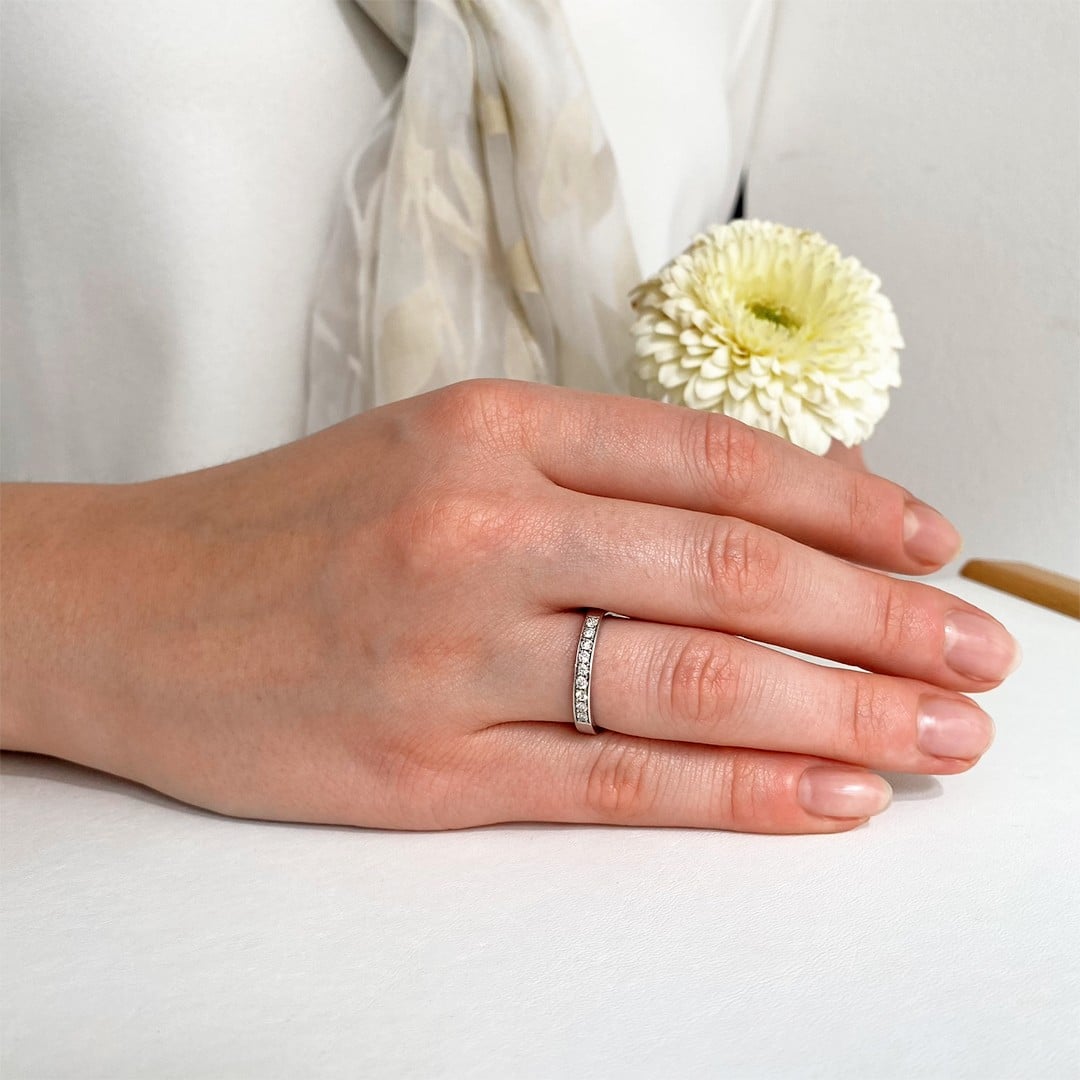 Dieser Diamantring aus 585 Weißgold ist mit neun funkelnden Brillanten besetzt, die in einer Reihe nebeneinander eingefasst sind. Die gleichmäßige Anordnung der Steine verleiht dem Ring eine harmonische Ausstrahlung und macht ihn zu einem eleganten Begleiter für jeden Tag. Ob als schlichter Ehering, als bedeutungsvolles Geschenk oder einfach als stilvolles Schmuckstück – dieser Ring passt immer und unterstreicht jede Schmucksammlung mit zeitloser Eleganz. Der Glanz der Brillanten und das kühle Weißgold ergeben eine klassische Kombination, die nie aus der Mode kommt und jeden Moment veredelt. Der Ring ist in der Weite 55 lagernd.