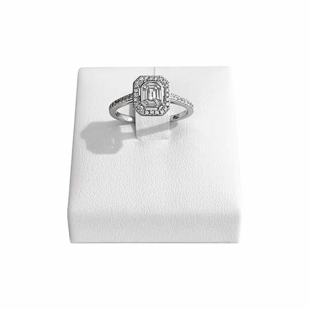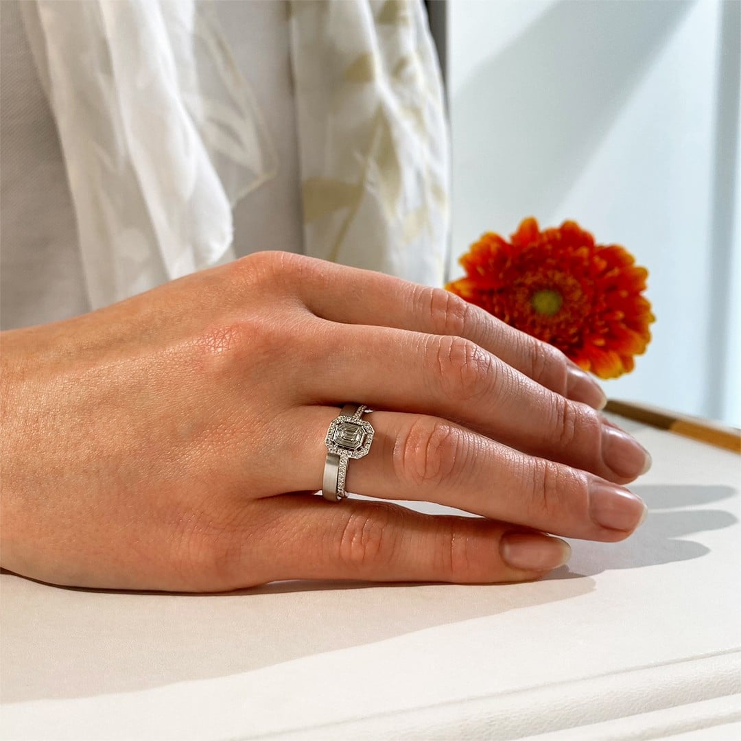Dieser Ring aus 750 Weißgold ist mit insgesamt 0,43ct Diamanten besetzt und besticht durch seine besondere Gestaltung. In der Mitte bilden rechteckige Diamanten in raffinierter Anordnung die Illusion eines großen zentralen Steins, während kleine runde Brillanten in der Ringschiene und an den Seiten feine Lichtakzente setzen. Die Kombination aus klarer Formensprache und funkelndem Detailreichtum verleiht dem Ring eine eindrucksvolle Präsenz, ohne dabei überladen zu wirken. Ein Schmuckstück, das Individualität und Emotion ausstrahlt – ideal als besonderes Geschenk.