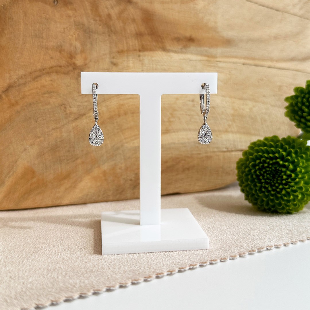 Diese edlen Brillantohrringe aus 750 Weißgold vereinen funkelnde Raffinesse mit eleganter Leichtigkeit. Der obere Teil ist als feine Creole gearbeitet und mit strahlenden Brillanten besetzt. Daran hängt ein bewegliches Element in tropfenförmiger Form, das ebenfalls mit Brillanten ausgefasst ist und bei jeder Bewegung dezent mitschwingt. Durch das Zusammenspiel von Form, Glanz und Bewegung entsteht ein stilvoller Ohrschmuck, der sowohl zu festlichen Anlässen als auch als elegantes Detail im Alltag getragen werden kann. Die hochwertige Verarbeitung und die anmutige Gestaltung machen diese Ohrringe zu einem besonderen Schmuckstück, das dezent auffällt und lange Freude bereitet.