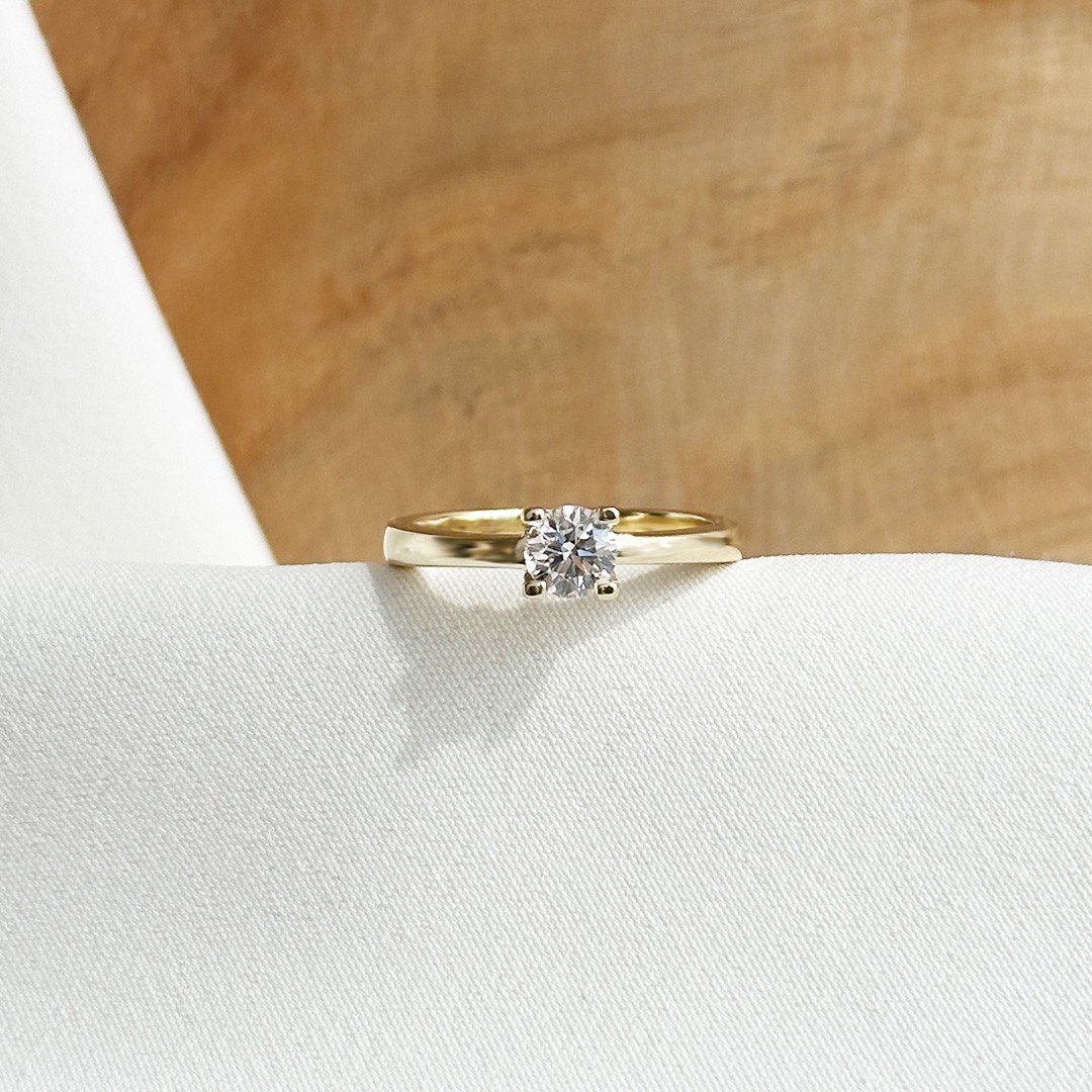 Dieser Solitär-Verlobungsring aus 585er Gelbgold überzeugt durch sein klassisches Design und seine solide Ausführung. Der Brillant mit 0,54ct. wird von einer 4-Krappen-Fassung gehalten, die so gearbeitet ist, dass viel Licht auf den Stein fällt und sein Funkeln optimal zur Geltung kommt. Der Ring zeigt Präsenz, ohne aufdringlich zu wirken, und ist so gefertigt, dass er ein Leben lang getragen werden kann. In Kombination mit einem Memoire Ring entsteht ein harmonisches Ensemble, das klassische Handwerkskunst und zeitlose Eleganz verbindet.