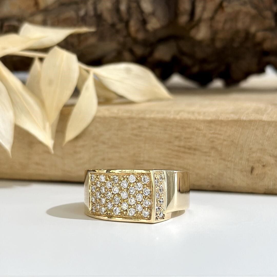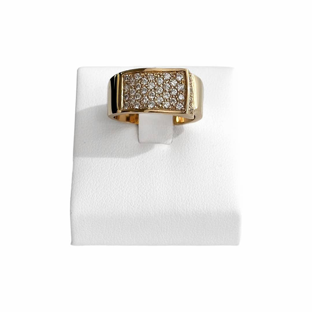 Dieser auffällige Ring aus 585er Gelbgold zieht mit seinem markanten Design sofort die Blicke auf sich. Besonders ins Auge fällt der funkelnde Brillantbesatz, der dem Ring eine besondere Dynamik und Strahlkraft verleiht. Obwohl er eine deutlich breitere Form aufweist, bleibt er durch seine flache Ausarbeitung angenehm zu tragen und wirkt keineswegs überladen. Die hochglanzpolierte Oberfläche unterstreicht die elegante Wirkung des Designs und verleiht dem Ring eine klassische Note. Ein idealer Begleiter für alle Damen, die gerne etwas Ausgefallenes tragen, dabei aber nicht auf zeitlose Eleganz verzichten möchten.