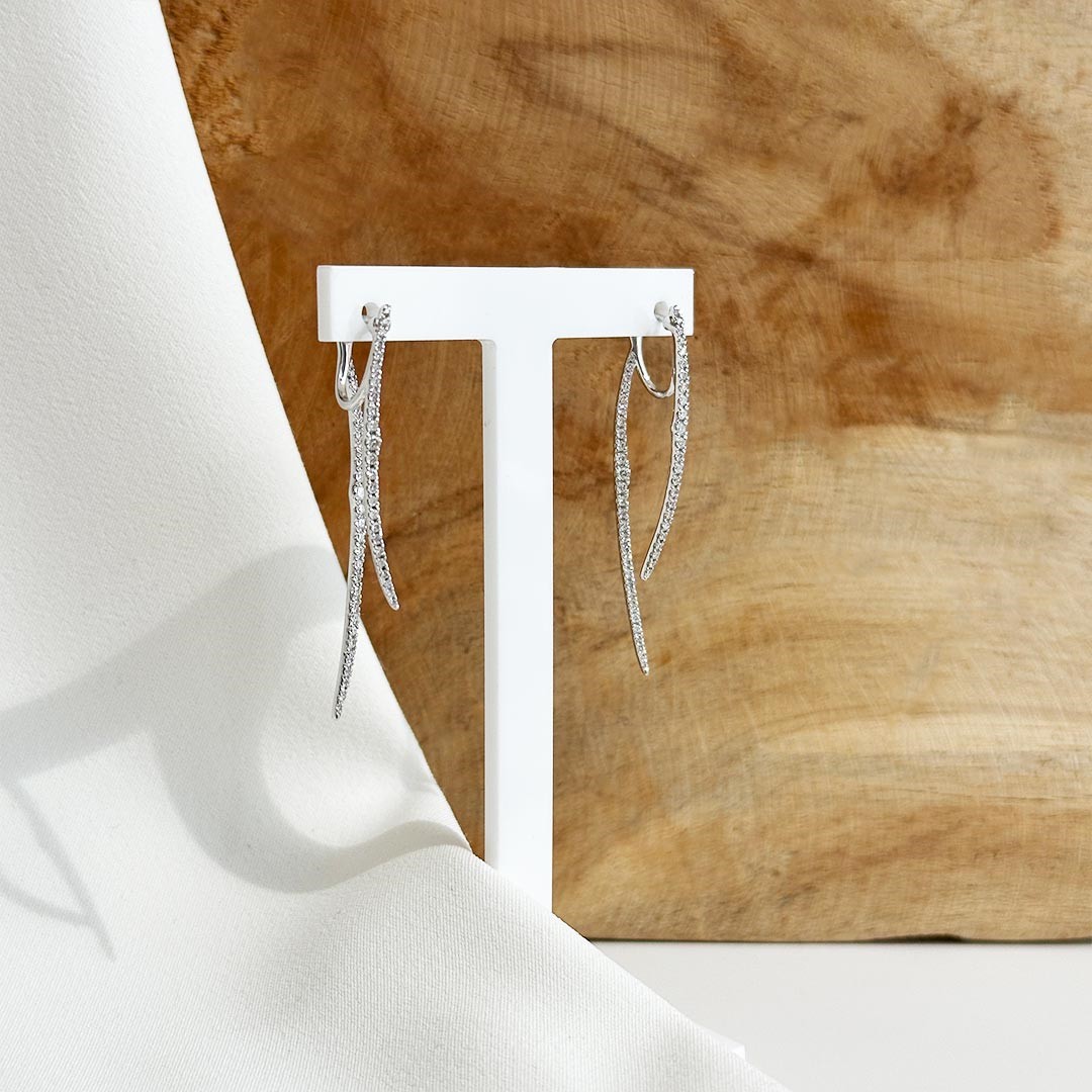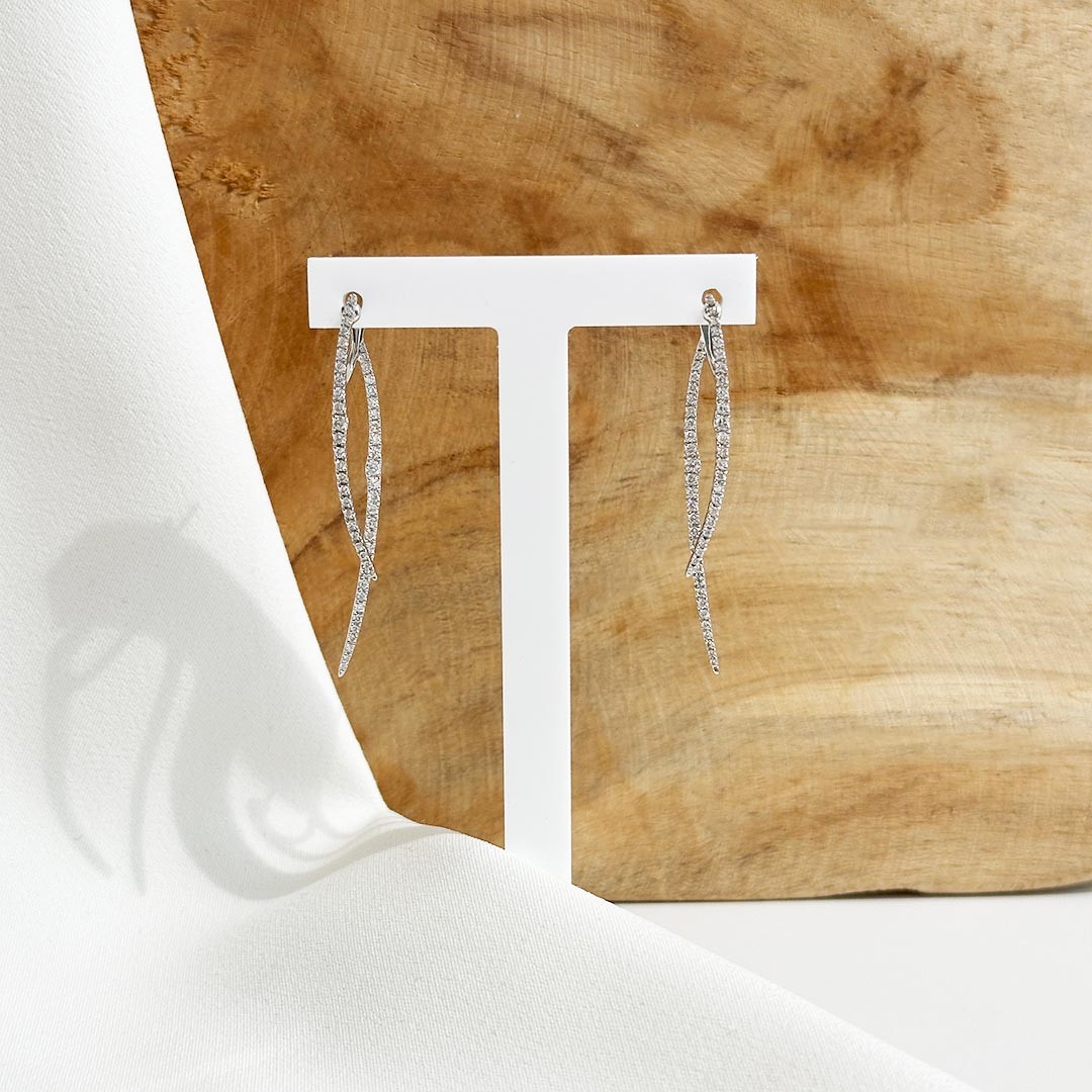 Diese Ohrgehänge aus 585 Weißgold verbinden moderne Klarheit mit klassischer Eleganz. Sie bestehen aus zwei leicht geschwungenen, versetzten Linien, die sanft ineinander übergehen – eine vor dem Ohrläppchen, die andere dahinter. Die dezent im Verlauf gefassten Brillanten in feinen Krappen setzen funkelnde Akzente, ohne aufdringlich zu wirken. So entsteht ein feiner Glanz, der den Ohrringen ein besonderes, elegantes Etwas verleiht. Diese Ohrgehänge sind ein unaufdringlicher Blickfang, der sich mühelos zu jedem Anlass kombinieren lässt und zeitlose Raffinesse ausstrahlt.