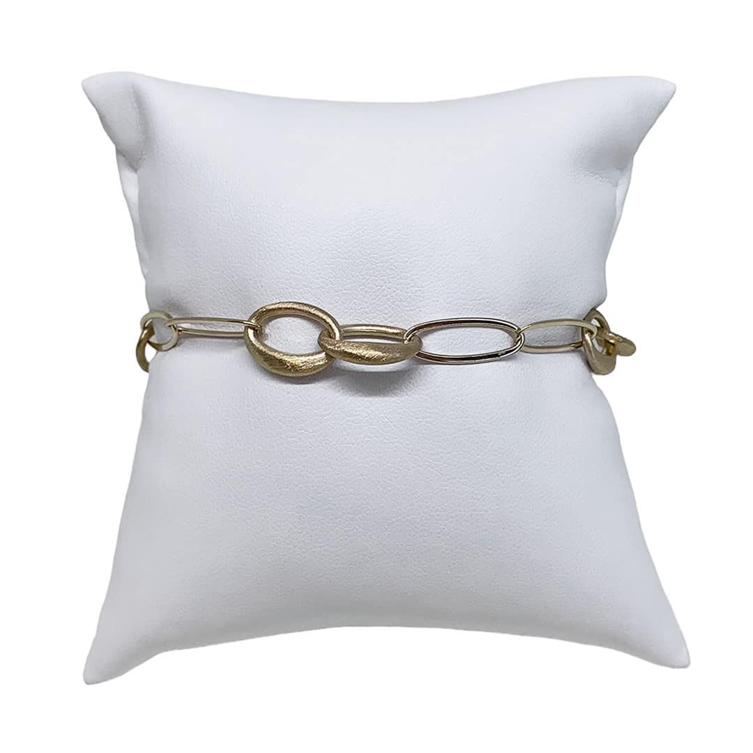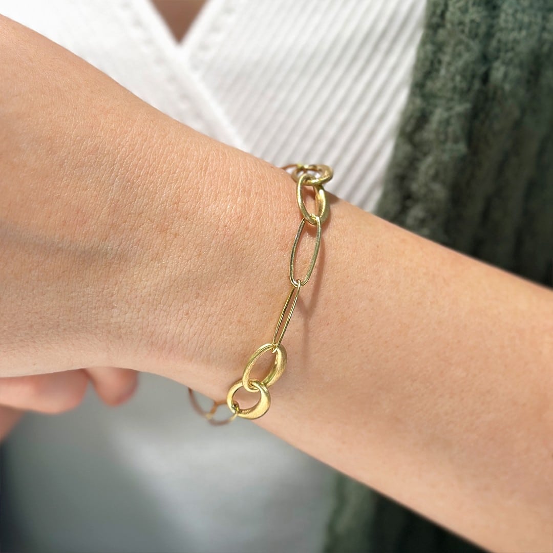 Dieses Gliederarmband aus 585er Gelbgold für Damen besticht durch seine abwechslungsreiche Gestaltung: Die einzelnen Glieder variieren in Größe, Form und Oberfläche – mal poliert, mal mattiert. Durch dieses Zusammenspiel entsteht eine lebendige Wirkung, die dem Armband eine moderne und zugleich elegante Ausstrahlung verleiht. Es lässt sich wunderbar mit weiteren Schmuckstücken wie Ohrringen oder einer feinen Kette kombinieren und bietet vielfältige Möglichkeiten, den persönlichen Stil zu unterstreichen – ein besonderes Stück, das vielseitig tragbar ist und zugleich Akzente setzt.