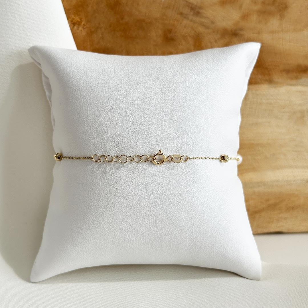 Dieses feine Armband aus 585er Gelbgold kombiniert kleine, facettierte Goldkügelchen mit weißen Süßwasserperlen in abwechselnder Anordnung. Die zarte Gestaltung und der Wechsel der Elemente verleihen dem Armband eine leichte, moderne Ausstrahlung, die sich mühelos zu verschiedenen Stilen und Anlässen tragen lässt. Mit einer Gesamtlänge von 19cm und einer praktischen Zwischenöse bei 17cm lässt es sich individuell anpassen und angenehm tragen. Ein stilvoller Begleiter, der dezente Eleganz mit einem Hauch verspielter Leichtigkeit verbindet.
