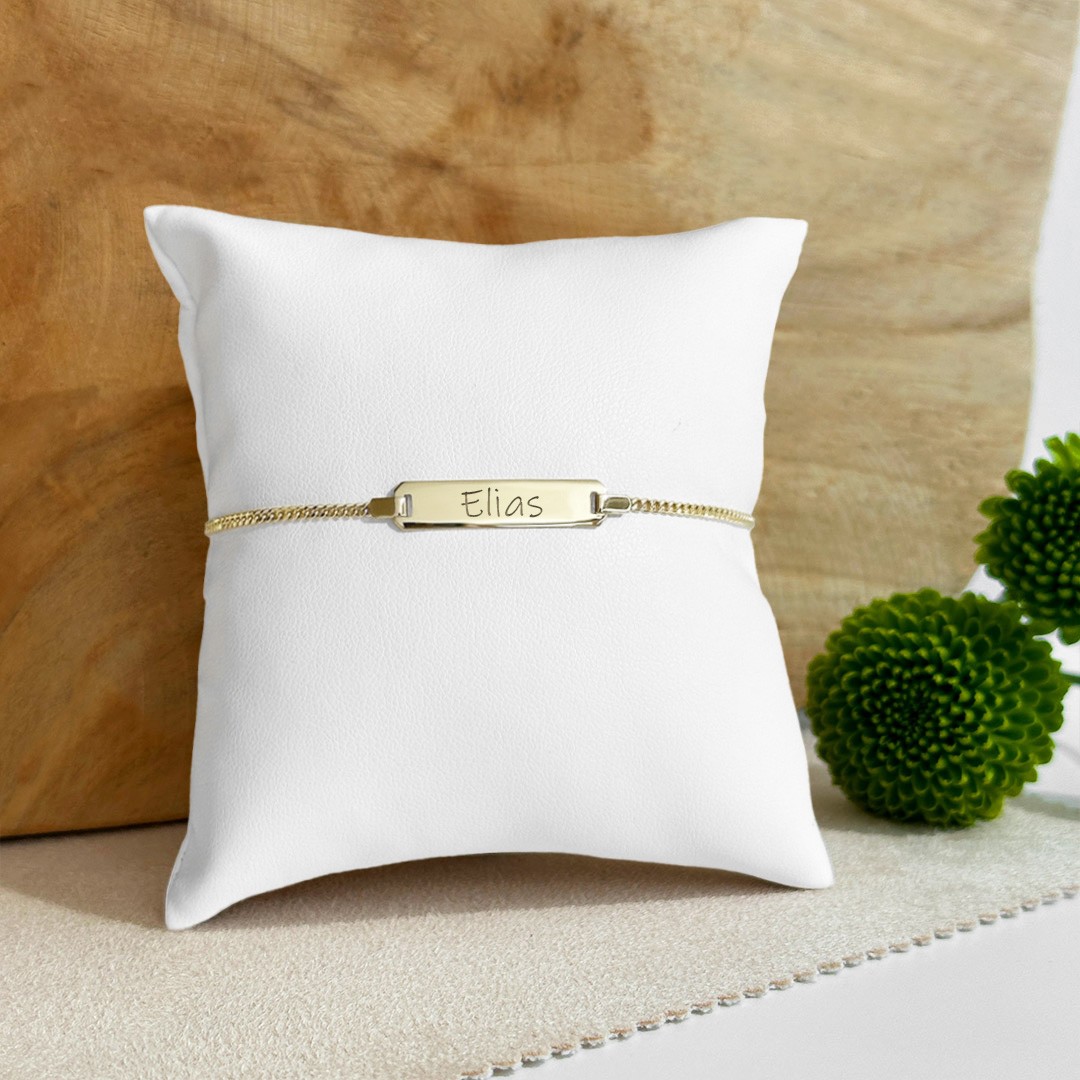 Feiern Sie besondere Momente im Leben mit unserem Schildarmband aus Gold. Dieses zeitlose Schmuckstück ist die perfekte Wahl für bedeutende Anlässe wie Erstkommunion, Firmung, Geburtstag, Matura und mehr. Gefertigt aus 585 Gold strahlt das Schild dieses Armbands eine klassische Eleganz aus, die für immer bestehen bleibt. Die fein gearbeitete 1,7mm breite Panzerkette verleiht dem Armband eine Raffinesse und macht es zu einem zeitlosen Accessoire, das auch nach Jahren noch seinen Glanz bewahrt. Das polierte Schild mit einer Länge von ca. 25mm bietet die Möglichkeit, nach Ihren Wünschen eine persönliche Gravur anzubringen, sei es der Name der Trägerin bzw. des Trägers oder das Datum des besonderen Anlasses. Auf diese Weise wird das Armband zu einem unvergesslichen Erinnerungsstück, das für immer geschätzt wird.