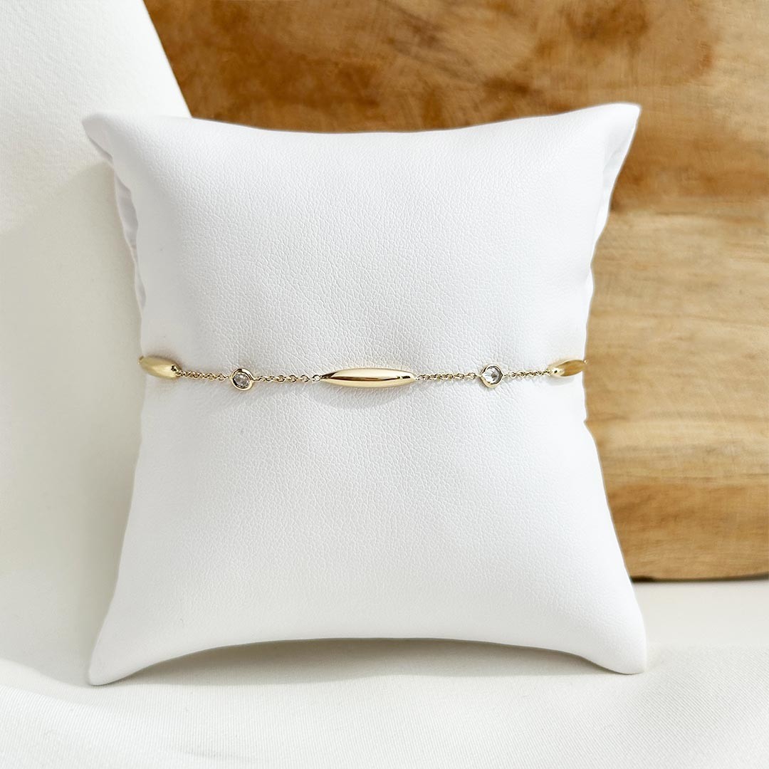 Dieses zarte Armband aus 585er Gelbgold besticht durch sein luftiges Design mit feinen, länglichen Goldelementen, zwischen denen kleine, farblose Zirkonia für dezente Lichtreflexe sorgen. Die Kombination aus glänzendem Gold und funkelnden Steinen verleiht dem Armband eine moderne, zugleich elegante Ausstrahlung. Mit einer Länge von 19cm und einer Zwischenöse bei 17cm lässt es sich individuell anpassen und angenehm tragen. Ein stilvolles Schmuckstück, das Leichtigkeit mit feinem Glanz verbindet – ideal für jeden Tag oder als feiner Akzent zu besonderen Anlässen.