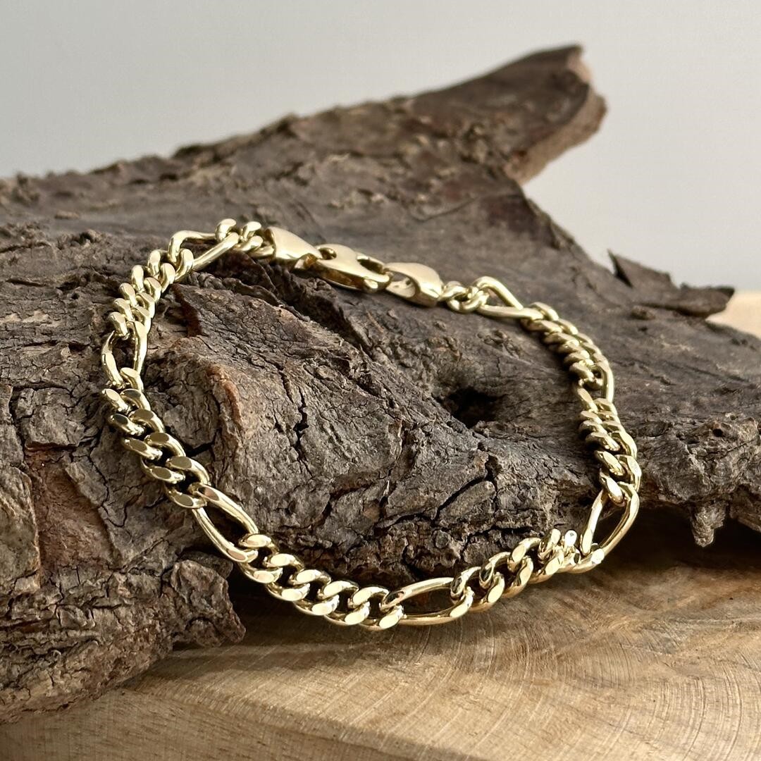 Figaro Goldarmband aus 585 Gelbgold mit einer Länge von 20cm und einer Breite von 5mm. Dieses Armband kann von Damen und Herren gleichermaßen getragen werden. Das Figaro-Muster ist eine besondere Art von Panzerkette mit einer speziellen Anordnung der Glieder. Ihre Glieder wechseln zwischen fünf runden und einem ovalen Kettenglied. Dadurch entsteht das klassische Design der Figarokette. Unser Figaro Goldarmband ist auch in anderen Längen erhältlich.