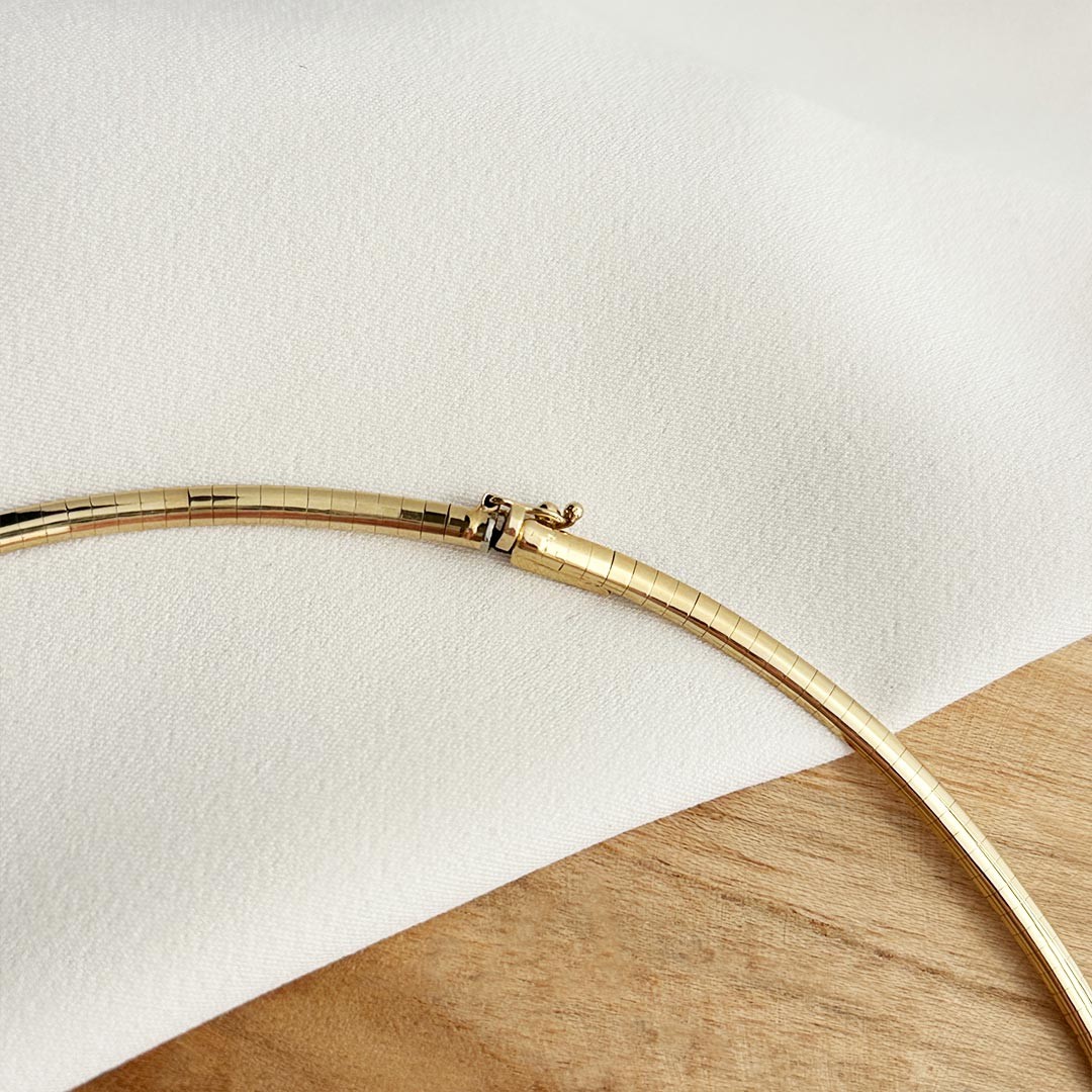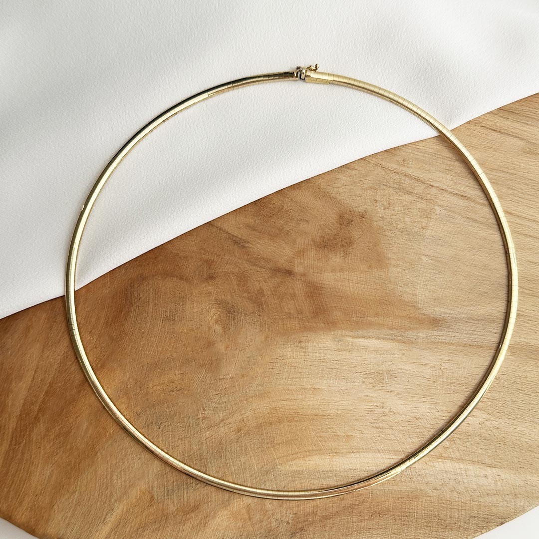 Dieser Omega-Reifen aus 585er Gelbgold ist leicht bombiert gearbeitet und hat eine Breite von 3mm – ideal für etwas größere Anhänger, aber auch ohne weiteres Schmuckstück ein eleganter Blickfang. Durch seine stabile Form legt sich der Halsreif ruhig und geschmeidig an den Hals und betont dabei dezent das Dekolleté. Die klare Linienführung und die glatte Oberfläche lassen dem getragenen Anhänger Raum zur Entfaltung, während der Reif selbst mit stilvoller Präsenz überzeugt. Ein vielseitiges Schmuckstück, das sich mühelos in den Alltag einfügt und auch zu besonderen Anlässen eine elegante Wahl ist.