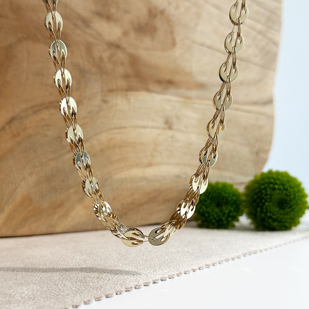 Diese Goldkette aus 585er Gelbgold für Damen ist ein wahrer Blickfang. Die Goldkette besteht aus zarten Plättchen, die auf eine besondere Art und Weise angeordnet sind und dadurch eine dreidimensionale Optik erzeugen. Dieses Collier ist ein perfektes Accessoire für besondere Veranstaltungen, aber auch für den Alltag, wie zum Beispiel für ein stilvolles Business-Outfit. Die Goldkette hat eine Länge von 44cm.