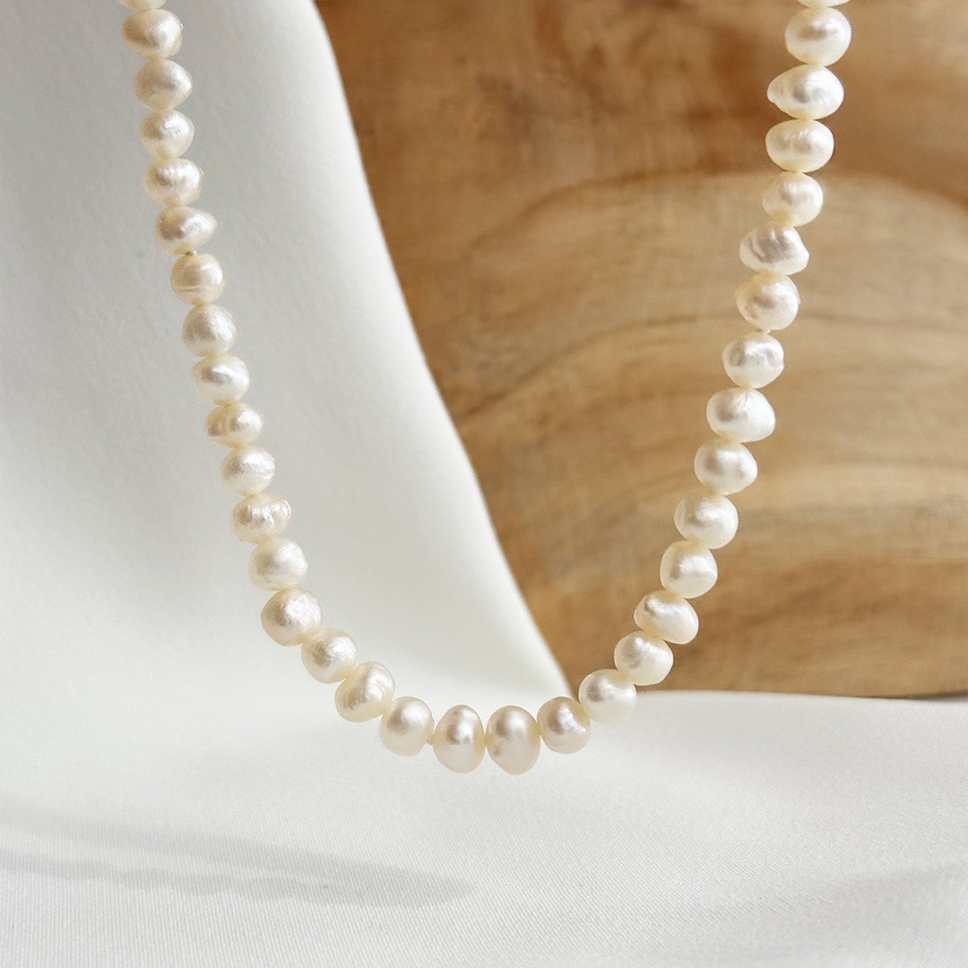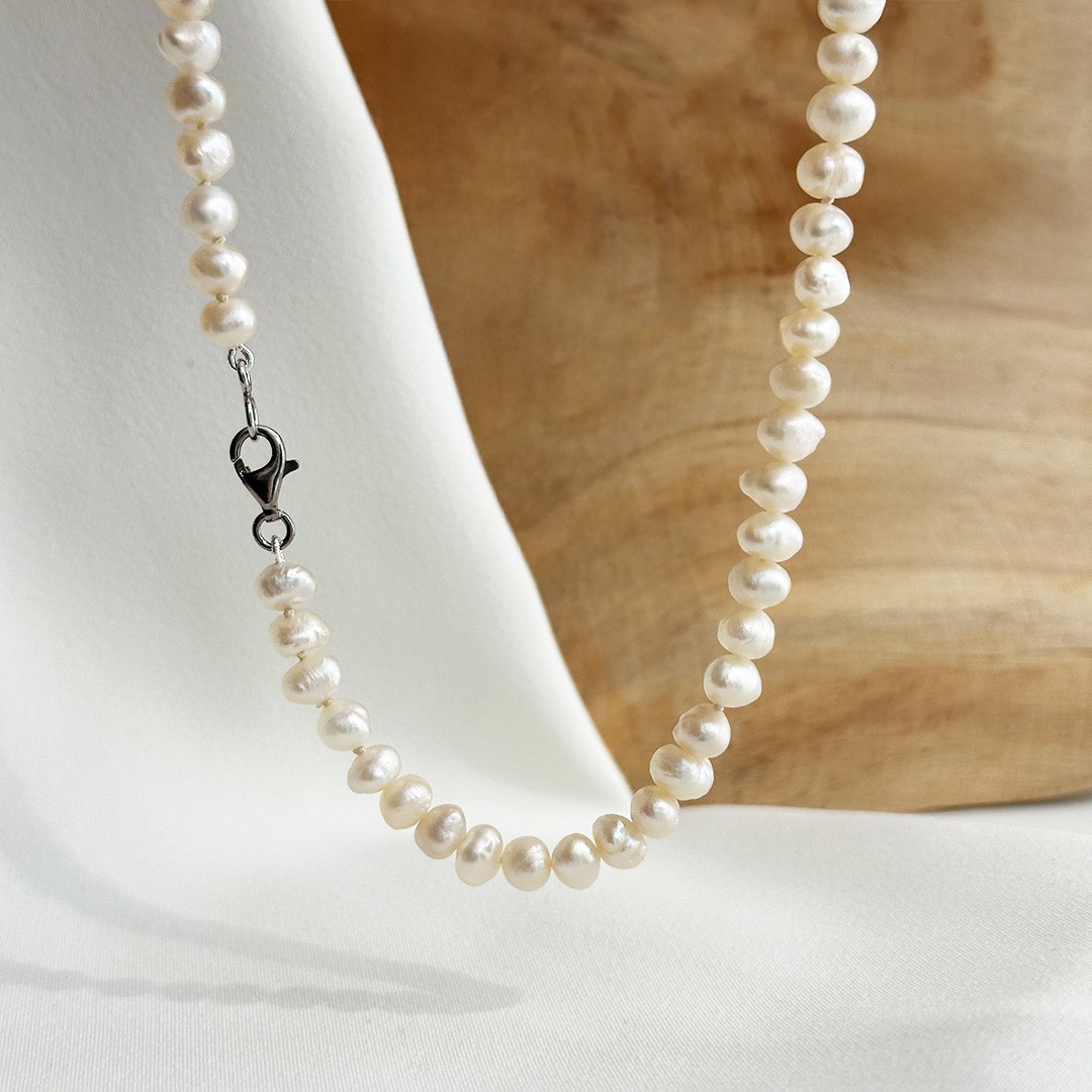 Diese Kette aus Süßwasserperlen besticht durch ihren natürlichen Charme. Die Perlen sind bewusst nicht vollkommen rund, sondern leicht oval und individuell geformt – jede einzelne mit eigenem Charakter. Mit einer Größe von 5 bis 6mm und einer Länge von 44cm legt sich die Kette harmonisch um den Hals. Der schlichte Karabiner aus 925 Silber bleibt dezent im Nacken verborgen, sodass die Perlen ihre volle Wirkung entfalten können. Eine feine Kette, die sich wunderbar mit Goldschmuck kombinieren lässt und sowohl solo als auch mit Anhängern oder passenden Ohrringen getragen werden kann.