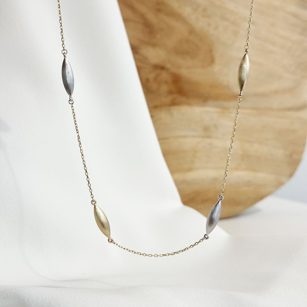 Diese Goldkette aus 585er Gold vereint Gelbgold und Weißgold in einem harmonischen Design. Die zarte Kette wird von länglichen, mattierten Zwischenelementen in Olivenform durchbrochen, die wiederum in Gelbgold und Weißgold gehalten sind. Diese dezente, aber raffinierte Gestaltung verleiht der Kette eine besondere Leichtigkeit und sorgt für ein stilvolles, modernes Gesamtbild. Dank der zweifarbigen Optik lässt sich die Kette vielseitig kombinieren – sie passt sowohl zu Gelbgold- als auch zu Weißgoldschmuck. Ein eleganter Begleiter, der jede Schmucksammlung bereichert.