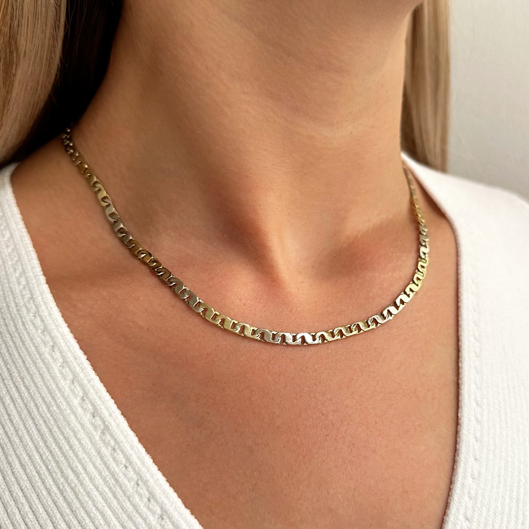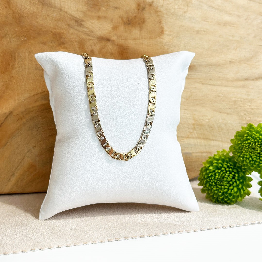 Diese Goldkette aus 585 Gelb- und Weißgold besticht durch ihr elegantes zweifarbiges Design, das vielseitige Kombinationsmöglichkeiten bietet. Mit einer Länge von 45cm und einer Breite von 3,7mm ist sie ein stilvoller Begleiter für den Alltag und besondere Anlässe. Die massive Verarbeitung verleiht der Kette eine hochwertige Haptik, während die harmonische Farbgebung sie ideal mit Brillant-Ohrsteckern oder Goldcreolen kombinierbar macht. Passend dazu finden Sie auch das passende Armband in unserem Sortiment.