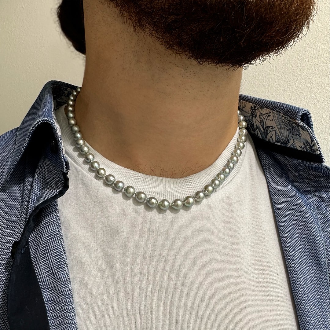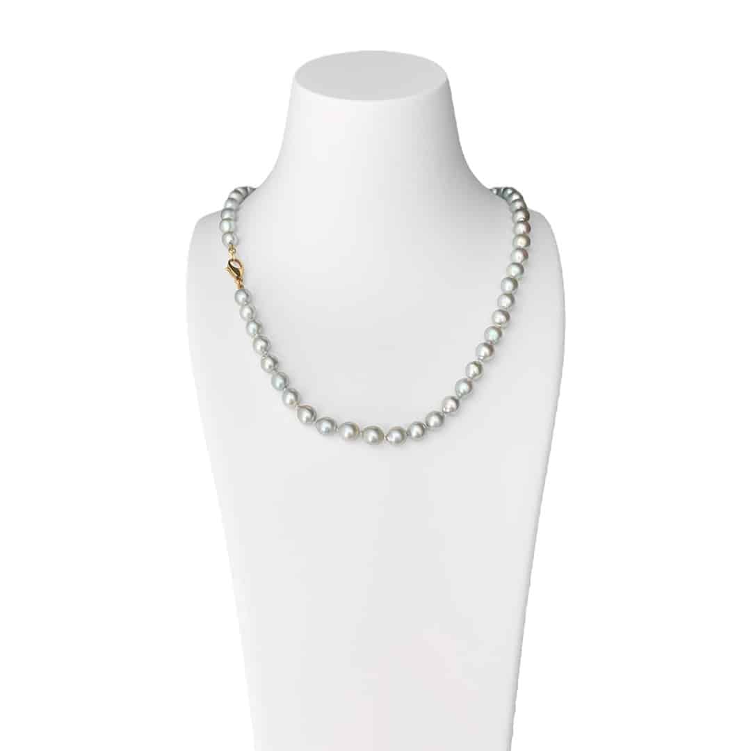 Diese Perlenkette aus fein schimmernden grauen Akoya-Perlen verbindet schlichte Eleganz mit modernem Stil. Mit einer Länge von 45cm und einer Perlengröße von 6,5–7mm eignet sie sich für alle, die zeitlosen Schmuck mit besonderem Ausdruck schätzen. Der Karabiner aus 585er Gelbgold sorgt für sicheren Halt und unterstreicht die hochwertige Verarbeitung. Die graue Farbgebung verleiht der Kette eine markante, edle Note – ein Ton, der sowohl bei Damen als auch bei Herren besonders beliebt ist. Ein modernes Schmuckstück, das durch seine natürliche Ausstrahlung überzeugt und sich vielseitig kombinieren lässt.