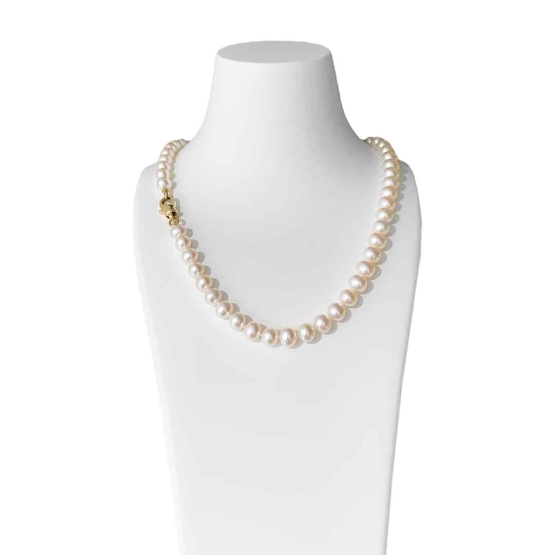 Diese klassische Süßwasserperlenkette ist zeitlos und vielseitig. Mit einer Länge von 45cm und einer Perlengröße von 8mm eignet sie sich perfekt für jeden Anlass. Die schmeichelnden Perlen passen zu jeder Kleidung, sei es zur legeren Jeans oder zum eleganten Abendkleid. Der 585 Gelbgold Karabiner ist ästhetisch und kann somit auch seitlich vorne als Blickfang getragen werden. Passend zur Kette können Goldohrringe oder Perlenohrstecker kombiniert werden, um einen harmonischen Look zu kreieren. Besuchen Sie uns und lassen Sie sich von unserer Auswahl inspirieren und beraten. Gerne zeigen wir Ihnen verschiedene Schmuckkombinationen. Gerne verpacken wir Ihnen das Schmuckstück passend zum Anlass.