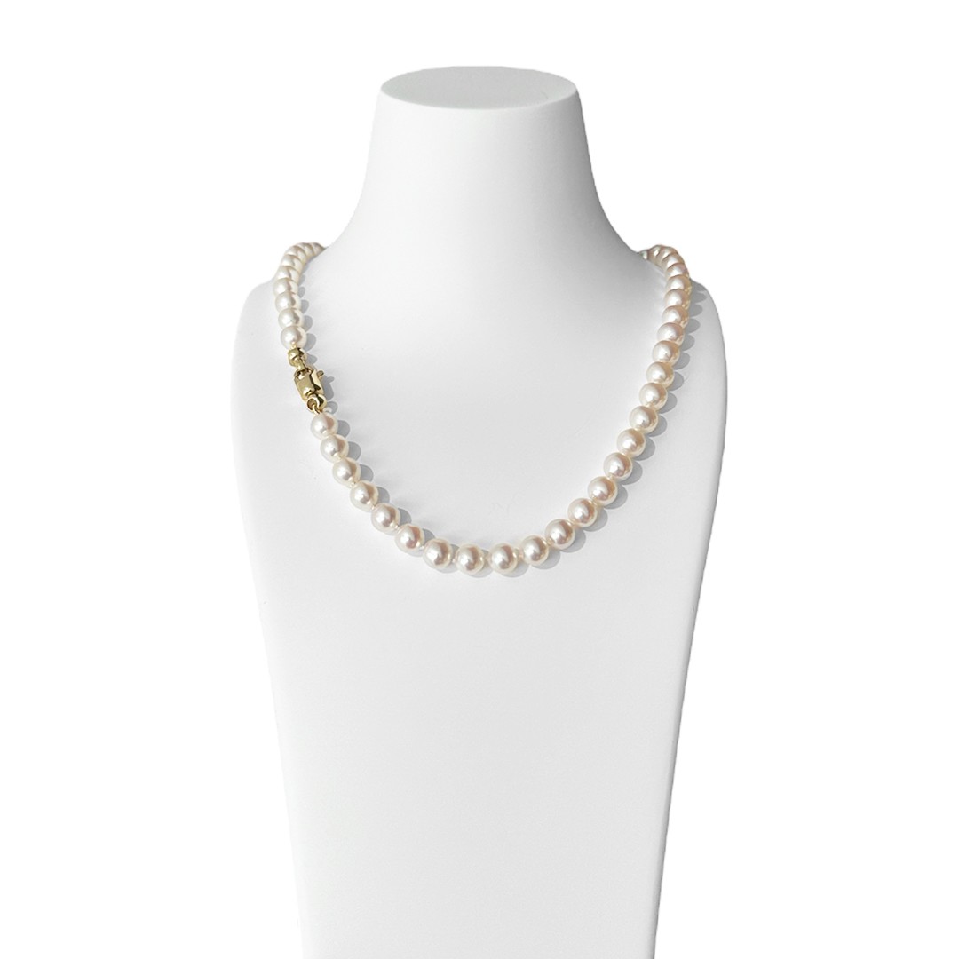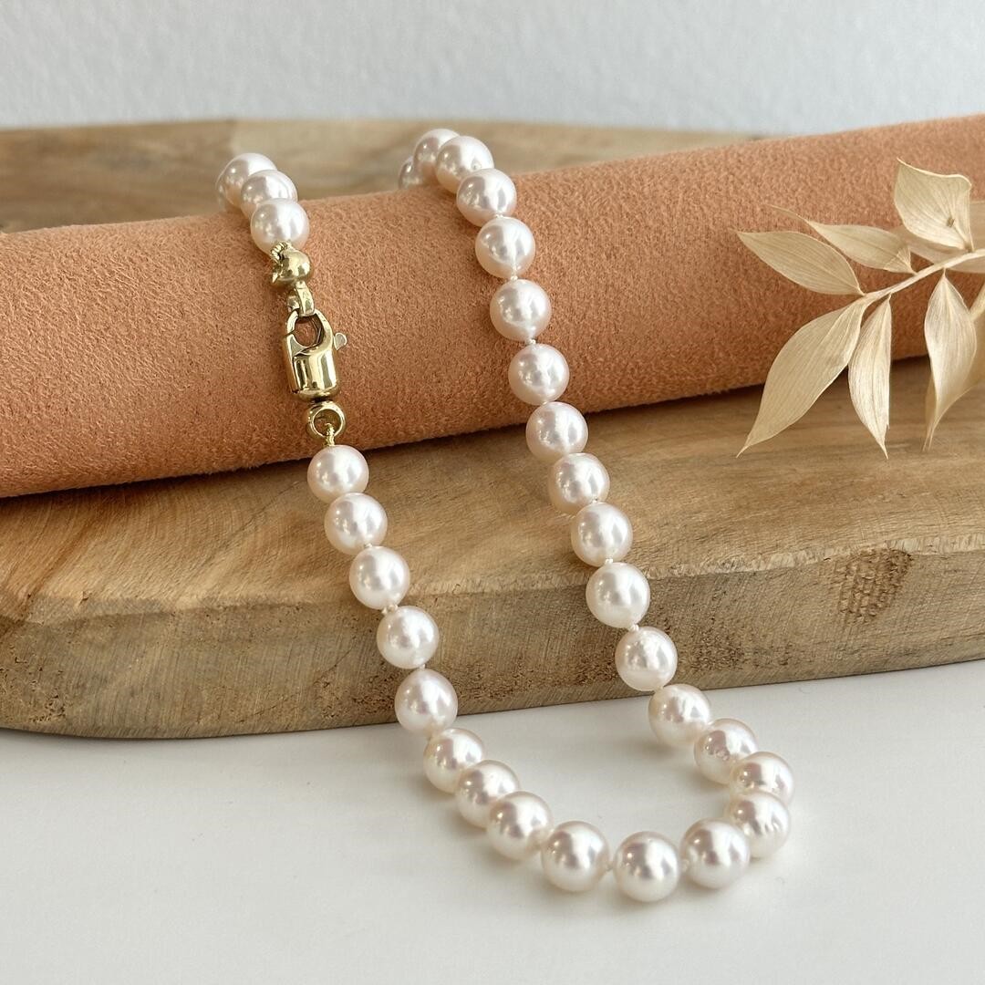 Die klassische Akoyaperlenkette mit einer Länge von 47cm ist ein zeitloses Schmuckstück, das mit einem eleganten 585er Gelbgold Karabiner geschlossen wird. Die Perlen haben eine Größe von 7,5 bis 8mm und strahlen eine schmeichelnde Eleganz aus. Die Goldschließe kann als Blickfang seitlich vorne getragen werden und verleiht der Kette eine ästhetische Note. Kombinieren Sie diese Perlenkette mit klassischen Perlenohrsteckern oder anderen Goldohrringen, wie zum Beispiel Goldcreolen aus unserem Sortiment. Unsere Perlenketten können selbstverständlich auch gekürzt und verlängert werden. Gerne verpacken wir Ihnen das Schmuckstück passend zum Anlass.