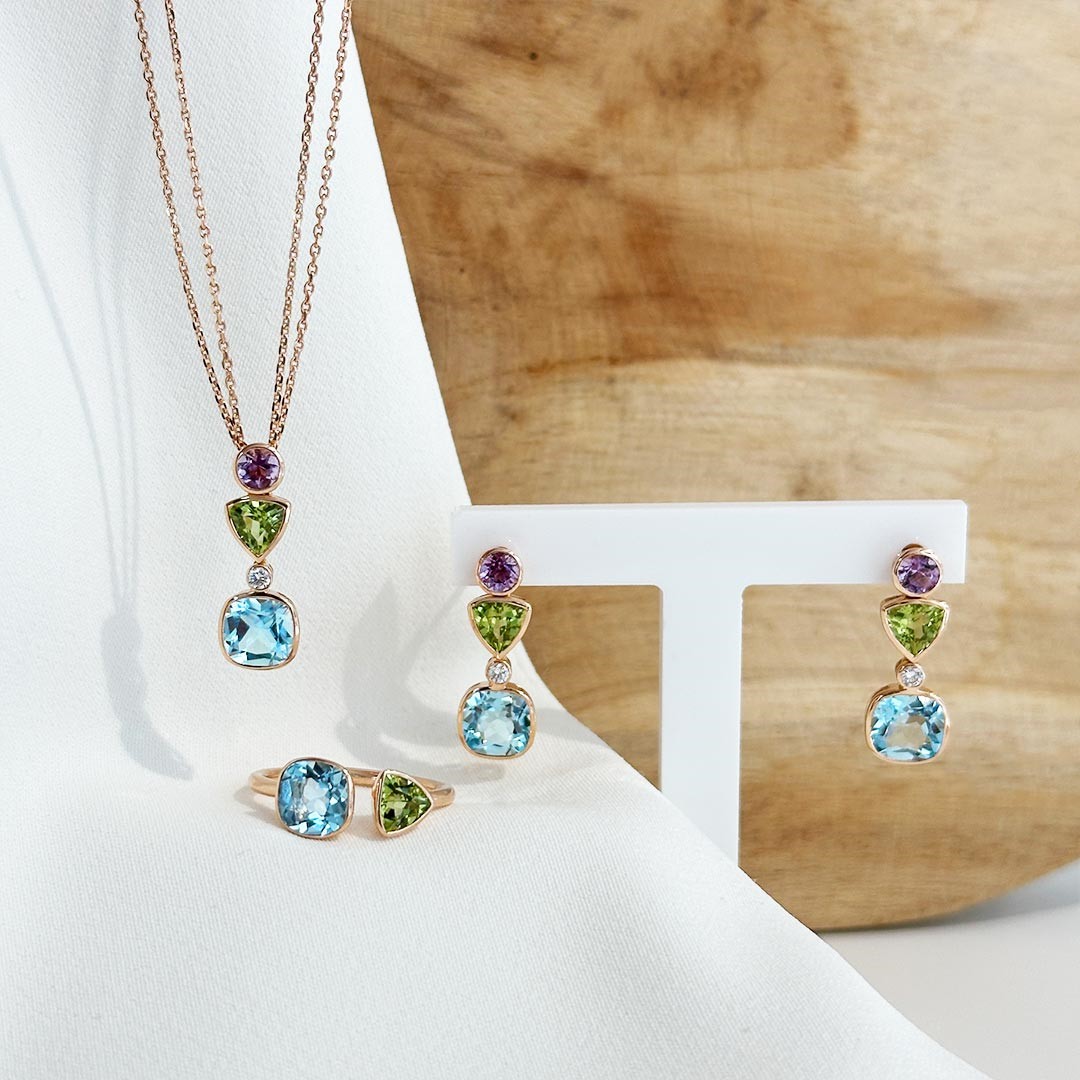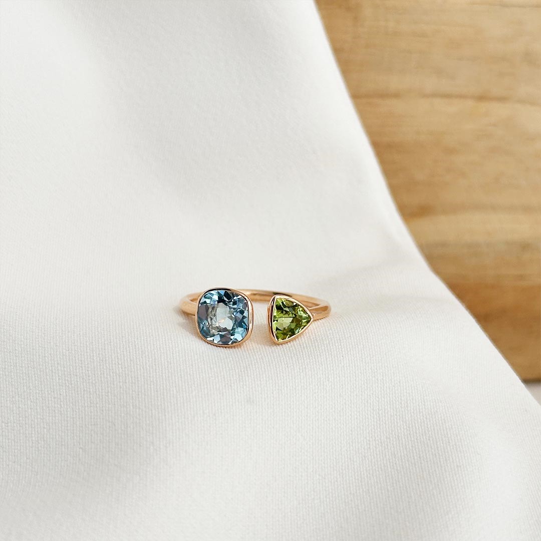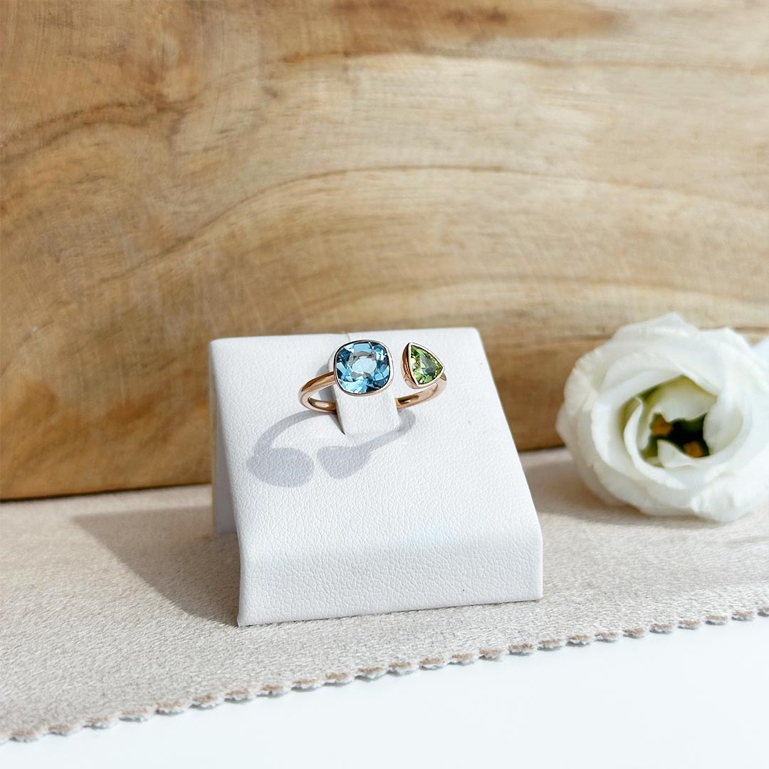 Der Ring aus 750er Roségold überzeugt durch sein modernes, offenes Design und eine fein abgestimmte Farbstein-Kombination. Ein Blautopas und ein Peridot in unterschiedlichen Schliffformen verleihen ihm eine besondere Leichtigkeit und unterstreichen die harmonische Farbgebung. Durch seine elegante, aber dezente Gestaltung ist der Ring sowohl solo als auch in Kombination mit passenden Schmuckstücken ein stilvoller Blickfang.