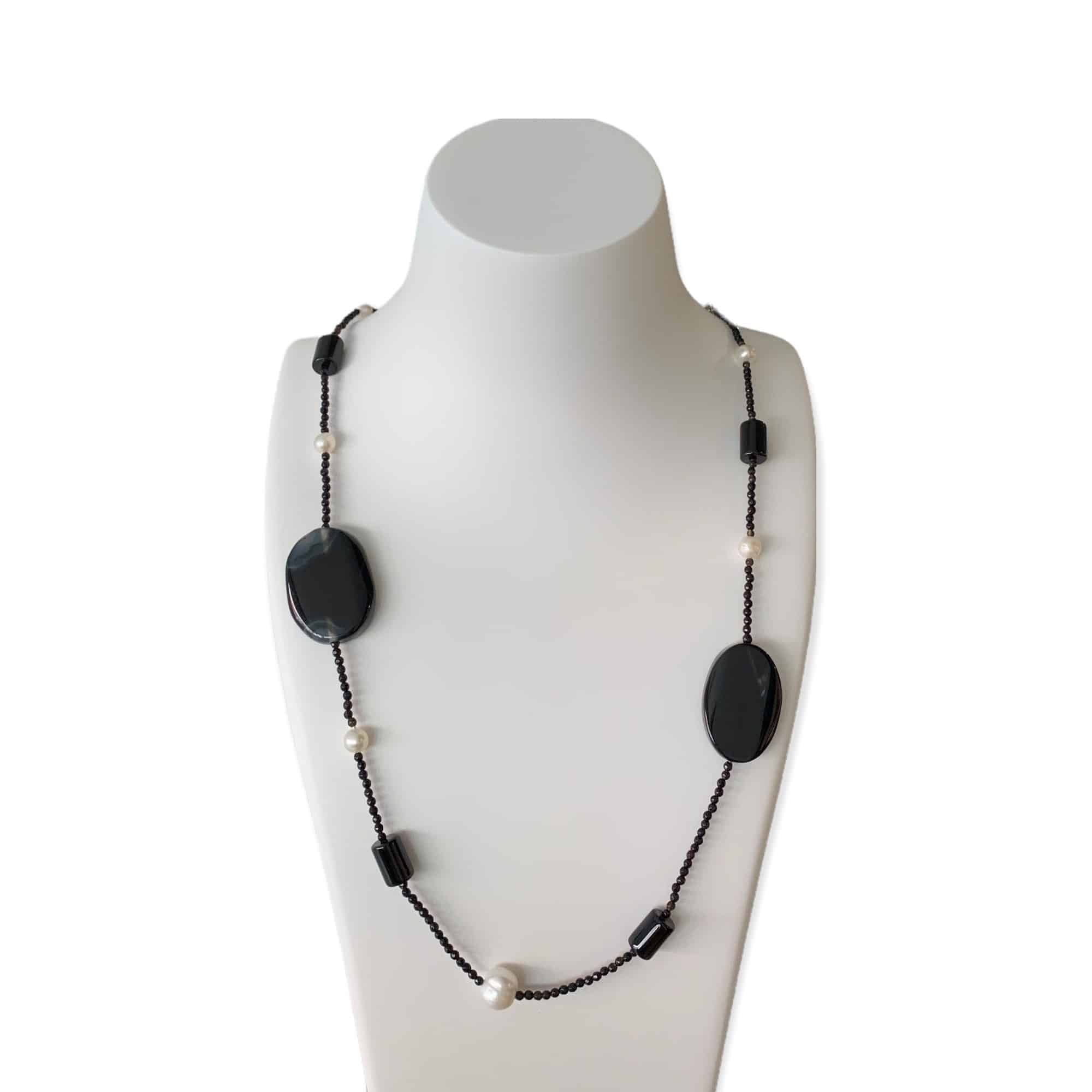 Diese stilvolle Onyxkette beeindruckt durch ihre Gestaltung. Die Kette, mit einer Länge von78cm, besteht aus Onyx-Elementen in verschiedenen Größen und Formen, die zwischendurch durch Süßwasserperlen aufgelockert werden. Ihr besonderes Design ermöglicht es, sie sowohl einzeln als auch in Kombination mit einer zweiten Kette zu tragen. Ob zu einem schlichten T-Shirt, einem Rollkragenpullover oder einem eleganten Kleid – diese Kette lässt sich mühelos in verschiedenste Outfits integrieren und verleiht das gewisse Etwas. Ein vielseitiges Accessoire, das sich perfekt für jede Gelegenheit eignet. Der Verschluss ist ein Springring aus 925 Silber rhodiniert.