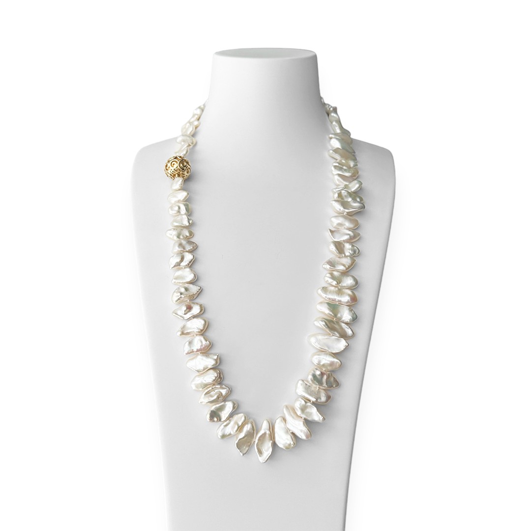 Diese Perlenkette besticht durch ihre außergewöhnliche Perlenform, die länglich und unregelmäßig ist und der Kette dadurch einen besonderen Charme verleiht. Der vergoldete Magnetverschluss aus 925 Silber ist nicht nur praktisch, sondern auch ein elegantes Designelement. Dank seiner interessanten Oberflächenstruktur kann der Verschluss auch als dekorativer Akzent getragen werden, indem man ihn seitlich nach vorne zieht. So wird die Kette auf raffinierte Weise unterbrochen und zieht alle Blicke auf sich. Diese Perlenkette verbindet traditionelle Eleganz mit modernem Design und ist perfekt für diejenigen, die nach einem besonderen Schmuckstück suchen.