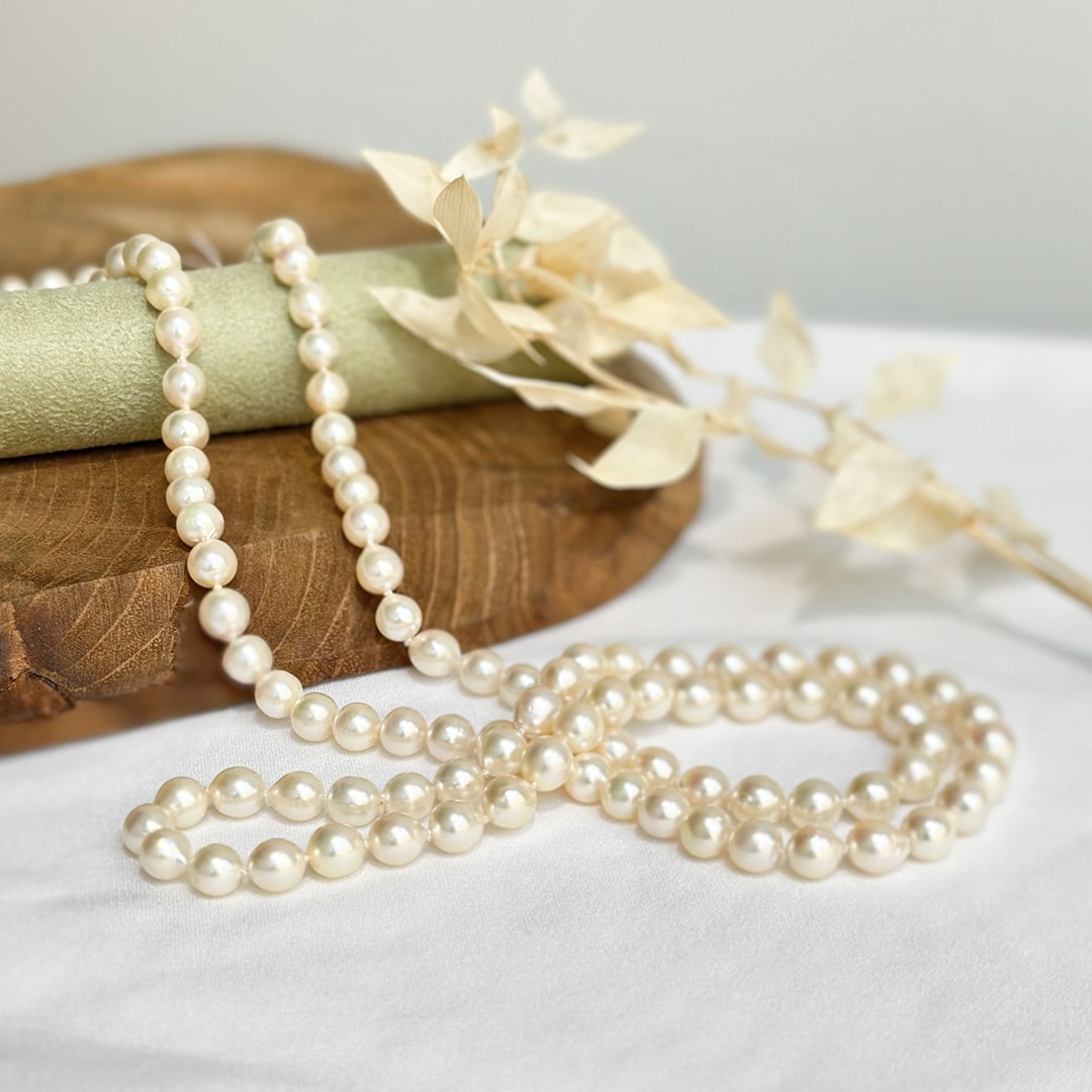 Unsere 90 cm lange Akoyaperlenkette ist ein faszinierendes Schmuckstück ohne Verschluss, mit Barockperlen von 7-7,5 mm Größe. Die nicht perfekt runde Form macht sie besonders interessant und einzigartig. Diese lange Perlenkette ist vielseitig einsetzbar und passt sowohl zum Sommerkleid als auch im Herbst und Winter über einen Rollkragenpullover oder zum Etuikleid. Sie lässt sich mühelos mit anderen Ketten kombinieren und ist somit ein idealer Begleiter für verschiedene Outfits. Durch ein Perlen-Collier Ring aus unserem Sortiment kann die Perlenkette auch zweireihig getragen werden, was ihr einen zusätzlichen Reiz verleiht. Entdecken Sie die Schönheit und die vielfältigen Kombinationsmöglichkeiten dieser außergewöhnlichen Akoyaperlenkette. Passend zur Kette können Goldohrringe oder Perlenohrstecker kombiniert werden, um einen harmonischen Look zu kreieren.