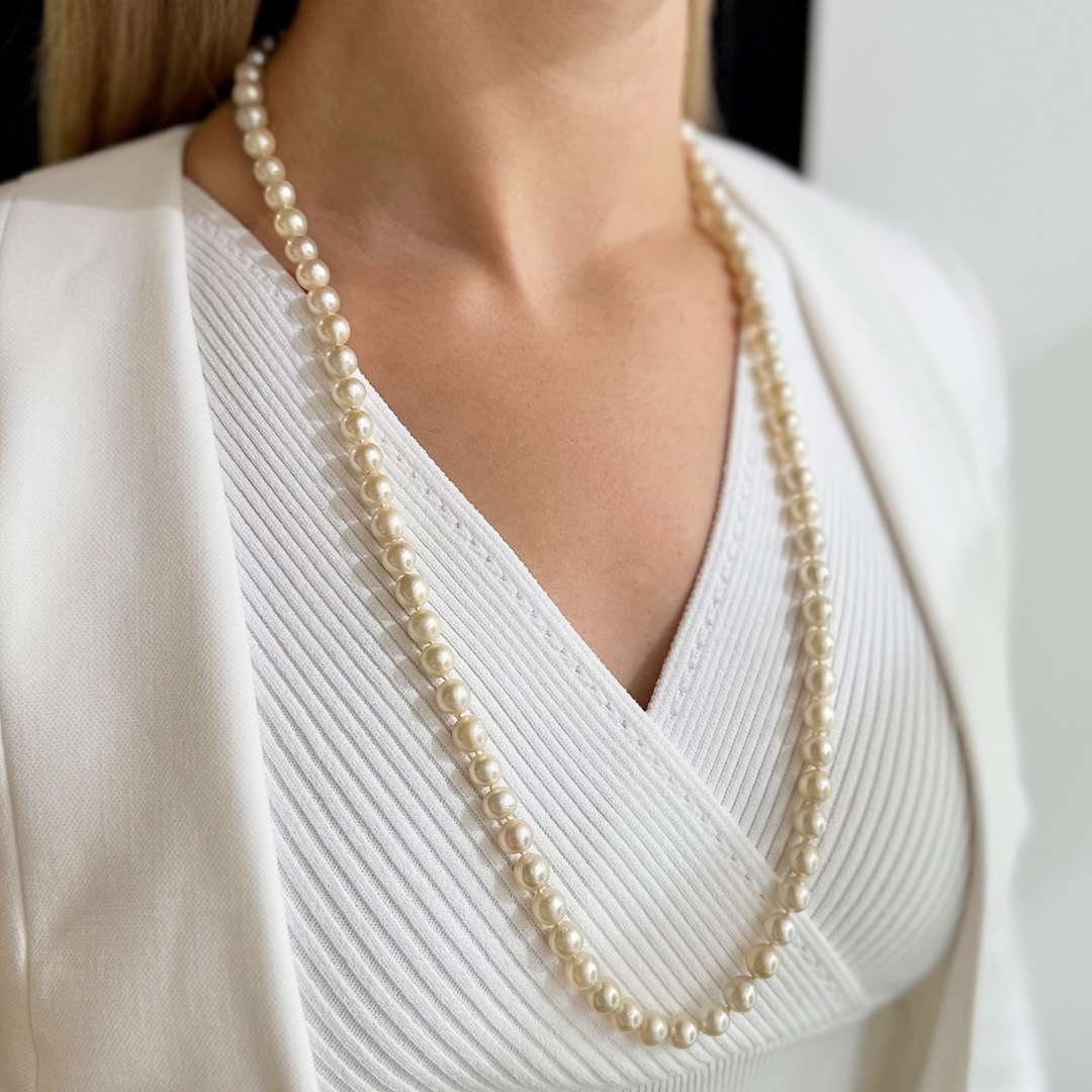 Unsere endlos geknüpfte Perlenkette mit einer Länge von 75 cm und einer Perlengröße von ca. 8-8,5 mm ist ein zeitloses Schmuckstück, das Eleganz und Vielseitigkeit vereint. Die Kette hat keinen Verschlusses, kann aber dank ihrer Länge ganz einfach über den Kopf angelegt werden, was sie äußerst bequem macht. Diese lange Perlenkette ist perfekt für diejenigen, die größere und längere Perlenketten bevorzugen. Sie ermöglicht es, verschiedene Looks zu kreieren und kann wunderbar mit anderen Ketten, wie beispielsweise Goldketten, kombiniert werden. Egal, ob Sie sie zu einem Etuikleid, einem T-Shirt oder über einem Rollkragenpullover tragen, lange Perlenketten passen einfach immer. Ihr zeitloses Design verleiht Ihrem Outfit einen Hauch von Raffinesse und Weiblichkeit.