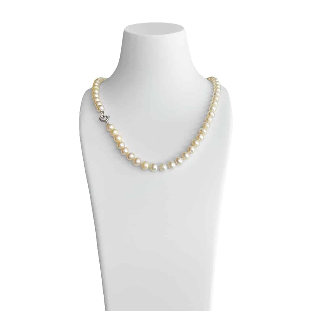 Unsere Perlenkette mit einer Länge von 48cm und Perlen in einer Größe von ca. 7-7,5 mm ist ein wahrhaft besonderes Schmuckstück. Das, was diese Kette auszeichnet, ist die unregelmäßige Form der Perlen, die ihr einen einzigartigen Charme verleiht. Diese Unregelmäßigkeit macht jede Perle zu einem individuellen Kunstwerk der Natur. Der schlichte 925 Silber Springringverschluss sorgt für eine sichere Befestigung und fügt sich harmonisch in das Design der Kette ein. Diese Perlenkette ist der ideale Begleiter für den Alltag und schmeichelt jedem Anlass, sei es im Büro oder in Ihrer Freizeit. Durch die Kombination von Unregelmäßigkeit und Eleganz erhalten Sie ein Schmuckstück, das fein und dennoch bemerkenswert ist. Tragen Sie diese Perlenkette, um Ihre Einzigartigkeit und natürliche Schönheit hervorzuheben.