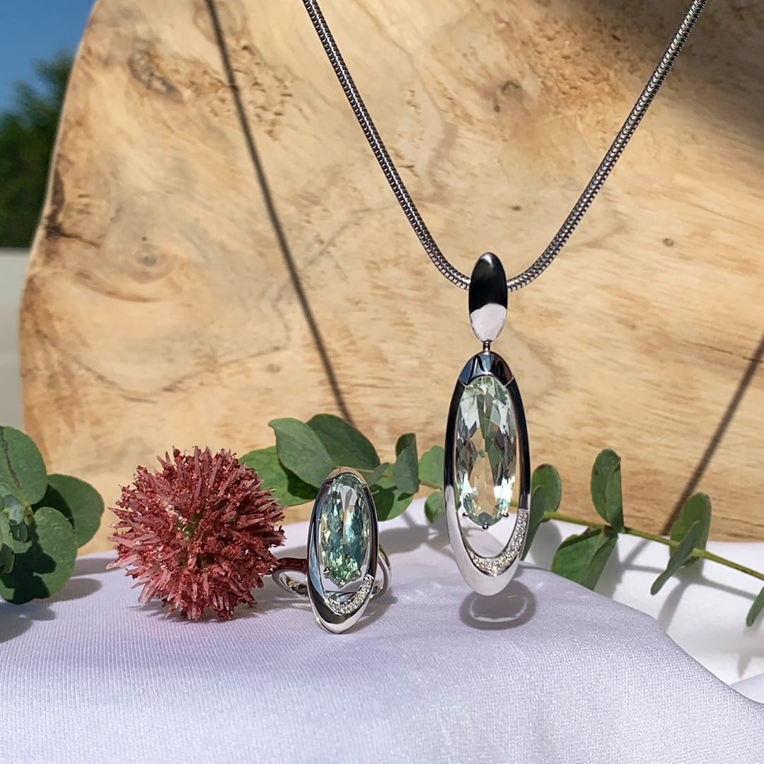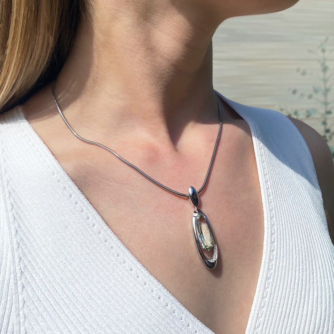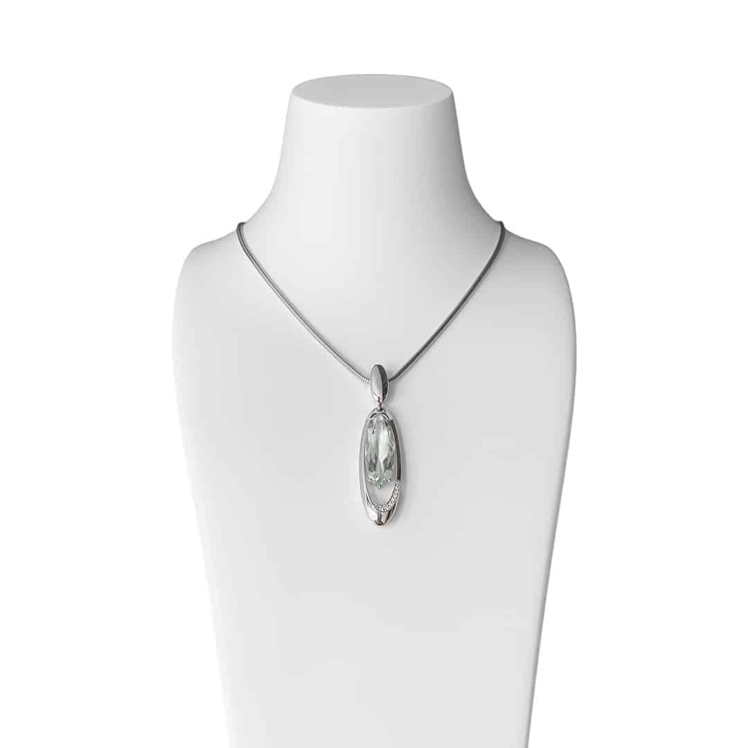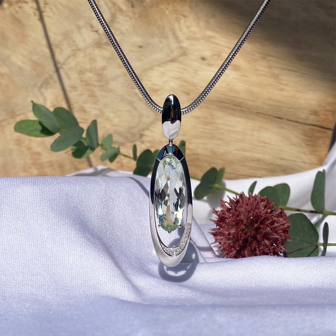 Dieser Anhänger ist aus 585er Weißgold gefertigt und besticht durch seinen atemberaubenden grünen Amethysten, auch Prasiolith genannt, und funkelnden Diamanten. Der ovale Anhänger hat eine Gesamtlänge von 52mm und ist mit einem durchbrochenen Design versehen, das ihm eine moderne und luftige Anmutung verleiht. Die kleinen Diamanten betonen das Design und sorgen für zusätzlichen Glanz. Der faszinierende grüne Amethyst schimmert bei jedem Lichteinfall auf den Facetten und schafft eine wunderschöne und zugleich geheimnisvolle Aura.