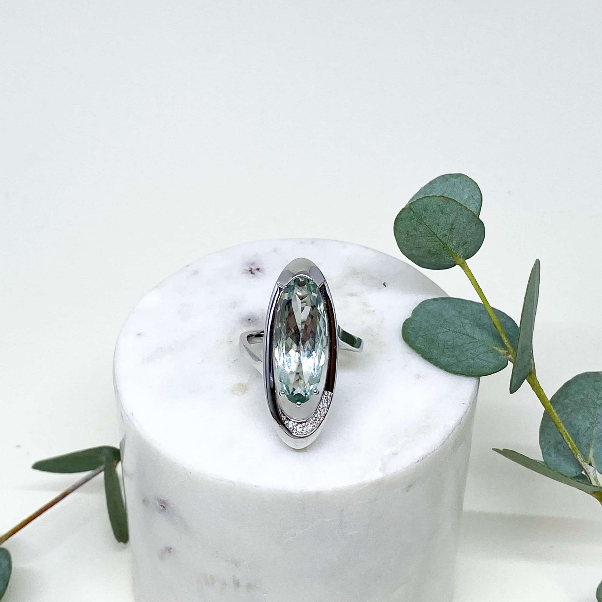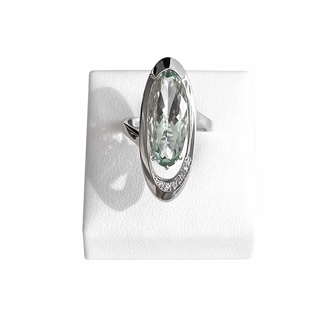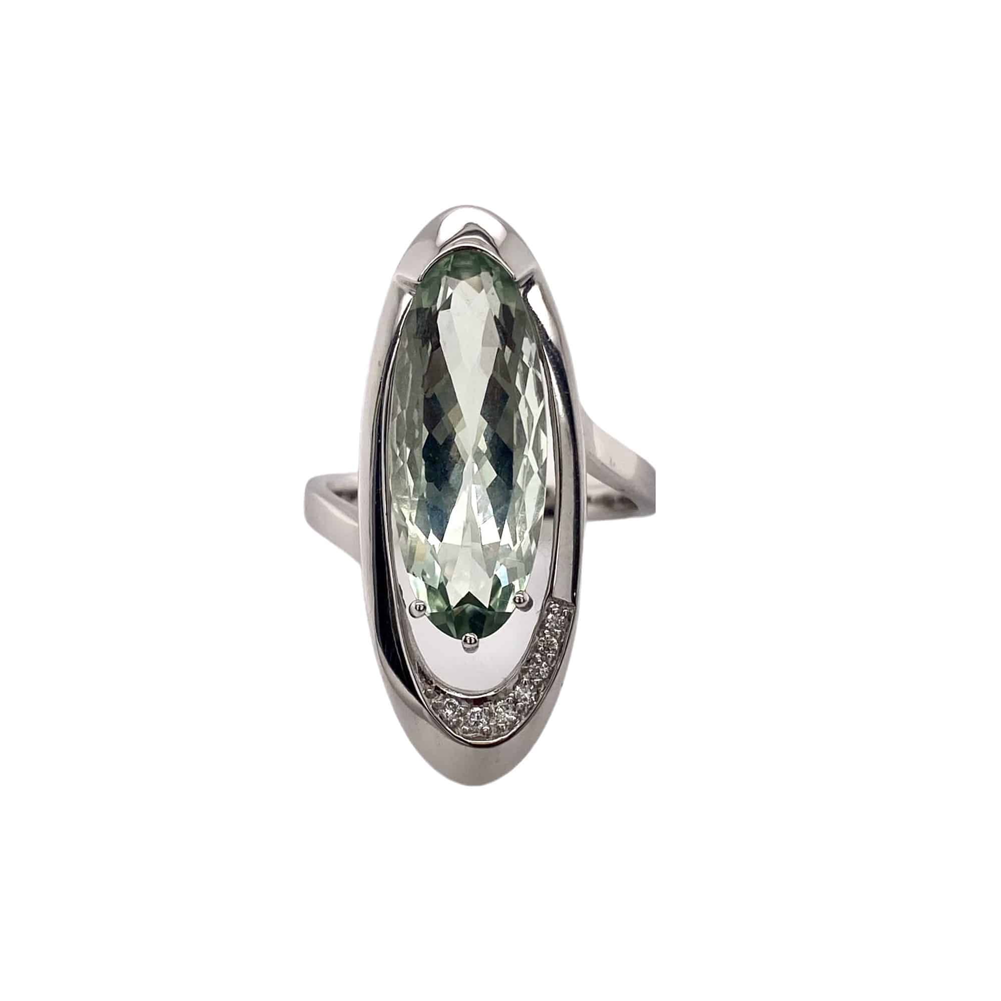 Dieser Ring ist aus 585 Weißgold gefertigt und besticht durch einen grünen Amethysten (Prasiolith) und funkelnden Diamanten. Der ovale Ring hat eine Gesamtlänge von 30mm und ist mit einem durchbrochenen Design versehen, das ihm eine moderne und luftige Anmutung verleiht. Die kleinen Diamanten betonen das durchbrochene Design und sorgen für zusätzlichen Glanz. Der faszinierende grüne Amethyst schimmert bei jedem Lichteinfall auf den Facetten und schafft eine wunderschöne und zugleich geheimnisvolle Aura.