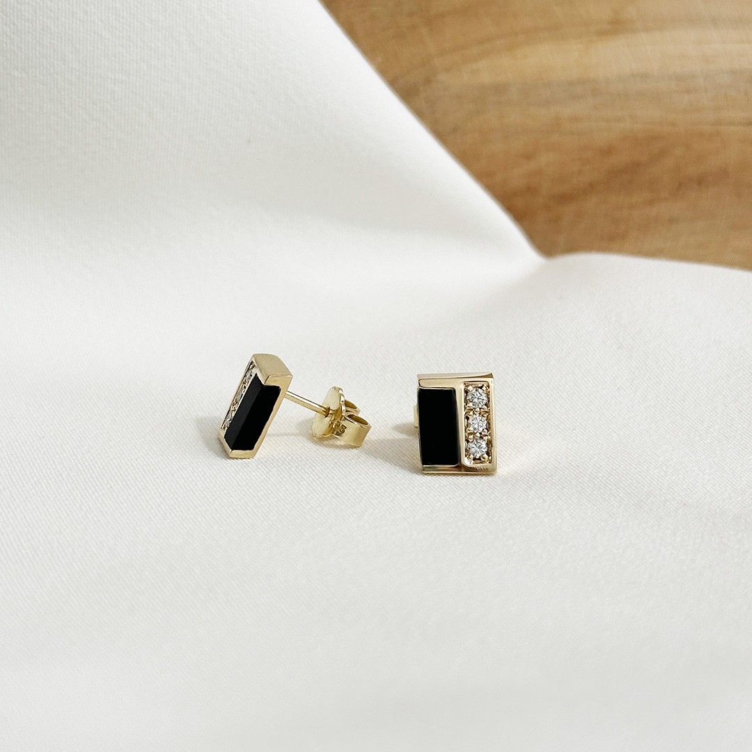 Diese handgefertigten Ohrstecker aus 585er Gelbgold vereinen präzise Goldschmiedekunst mit einer klaren, modernen Ästhetik. Jeder Stecker ist rechteckig geformt und misst 9mm. Die eine Hälfte ist mit einem fein geschliffenen Onyx ausgelegt, der passgenau in die Goldfassung eingearbeitet wurde, während auf der anderen Seite drei kleine Brillanten gefasst sind. Dieses elegante Zusammenspiel von tiefem Schwarz und funkelndem Licht verleiht den Ohrringen eine ruhige, edle Ausstrahlung mit subtiler Ausdruckskraft. Die polierte Oberfläche unterstreicht die schlichte Eleganz und feine Handarbeit des Goldschmieds. Ein Schmuckstück, das Stilbewusstsein und handwerkliche Präzision in perfekter Balance vereint.