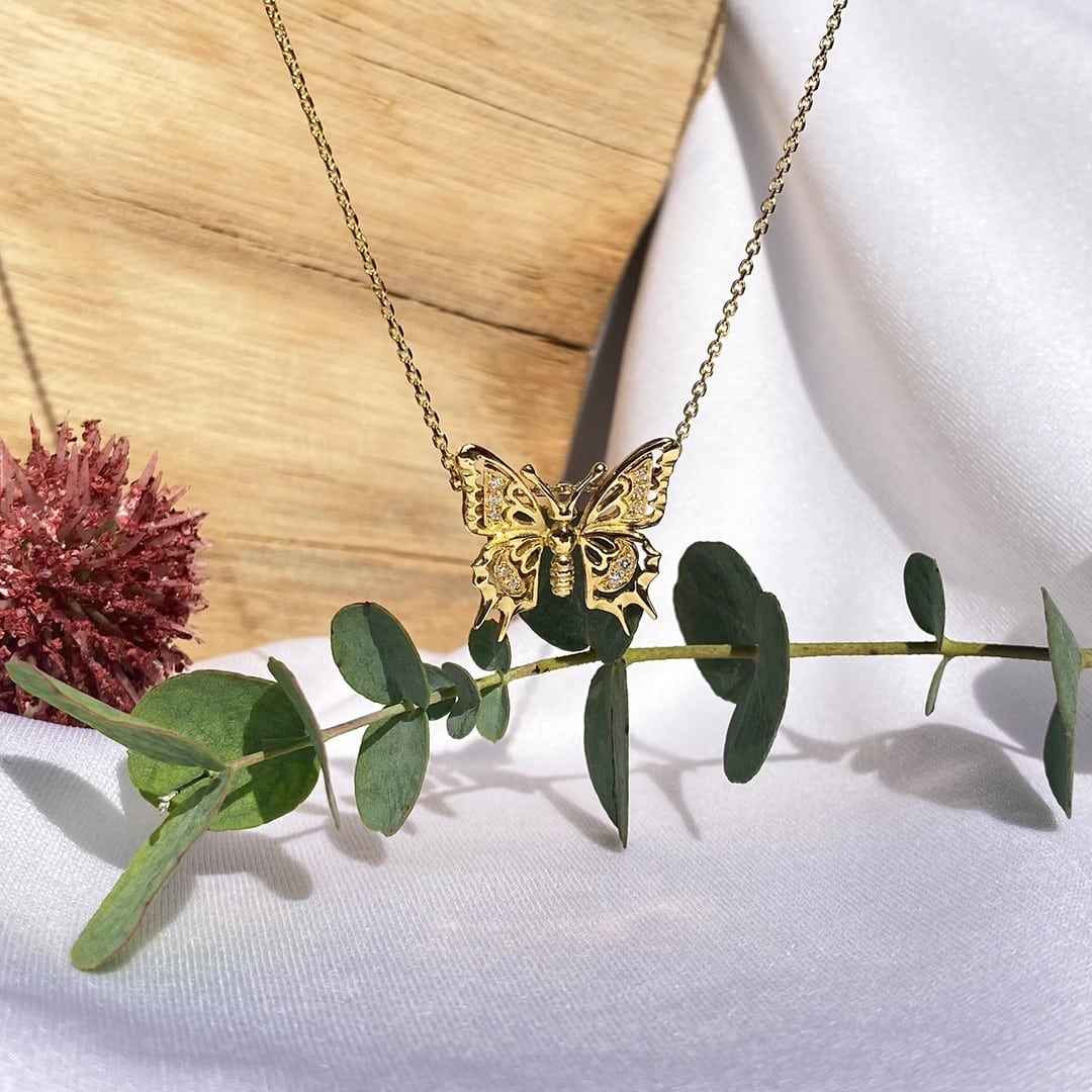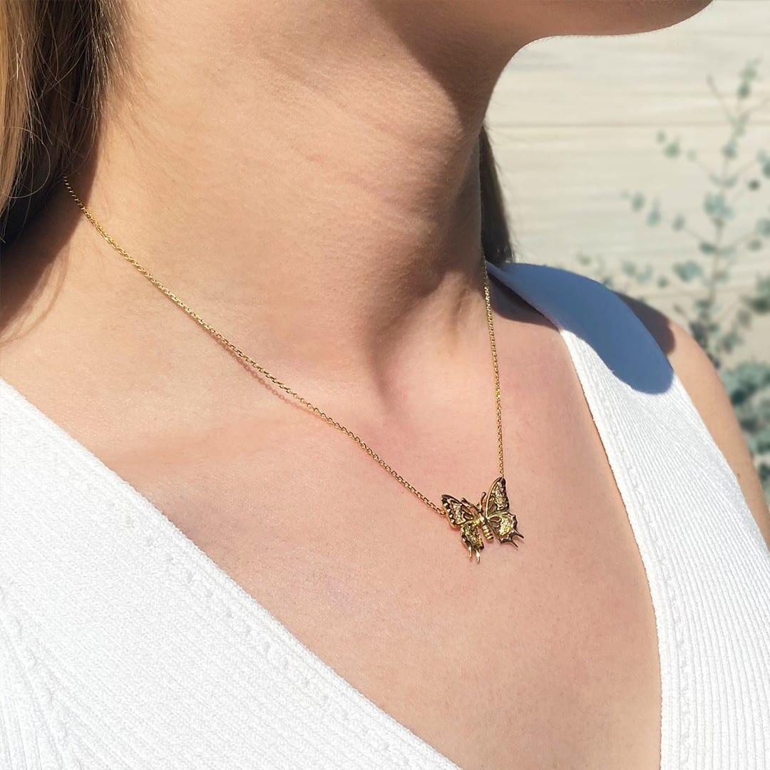 Ein Hauch von Eleganz und Leichtigkeit: Dieser Schmetterling-Anhänger aus 750er Gelbgold begeistert mit seinem feinen Design und strahlender Brillanz. Besetzt mit insgesamt 0,10ct funkelnden Brillanten verleiht er ein zartes Leuchten und zieht bewundernde Blicke auf sich. Der Schmetterling symbolisiert Veränderung, Freiheit und die Schönheit der Natur – eine tiefere Bedeutung, die diesem Schmuckstück seine besondere Ausstrahlung verleiht. Mit einer Größe von ca.18×20 mm schmiegt sich der Anhänger harmonisch ans Dekolleté und eignet sich perfekt als täglicher Begleiter oder als besonderes Geschenk. Kombinieren Sie den Halsschmuck mit schlichten Ohrsteckern.