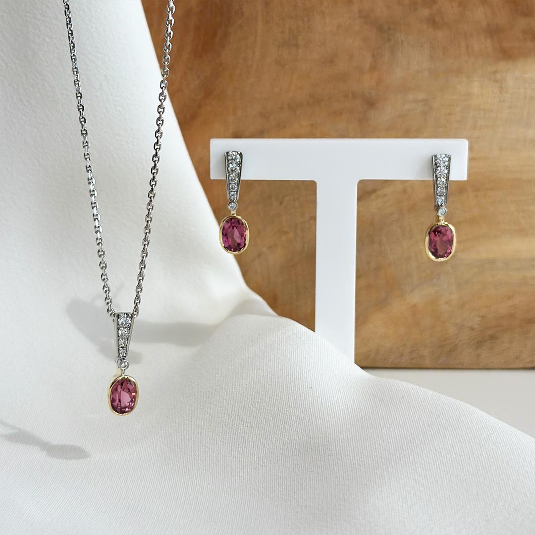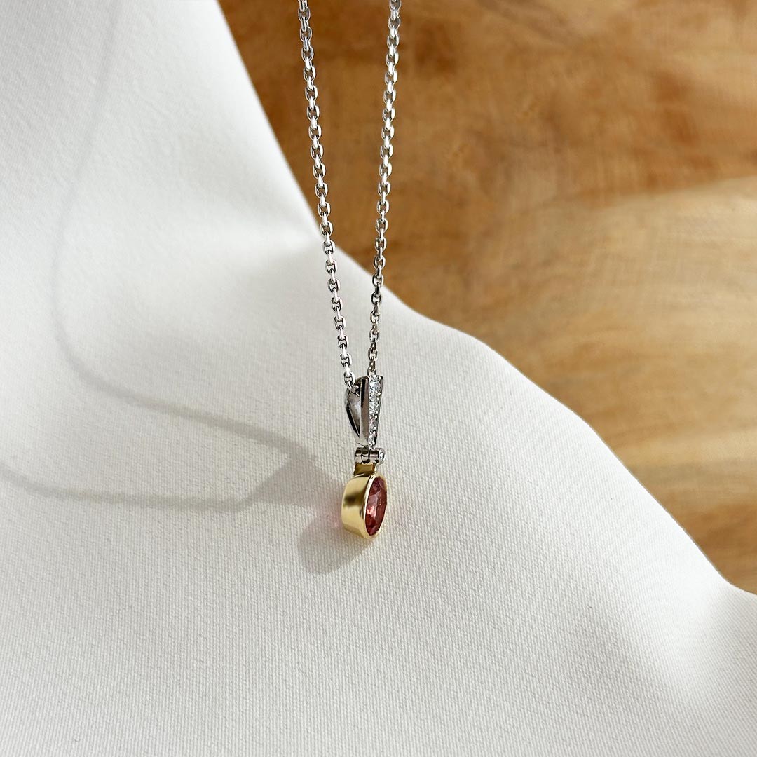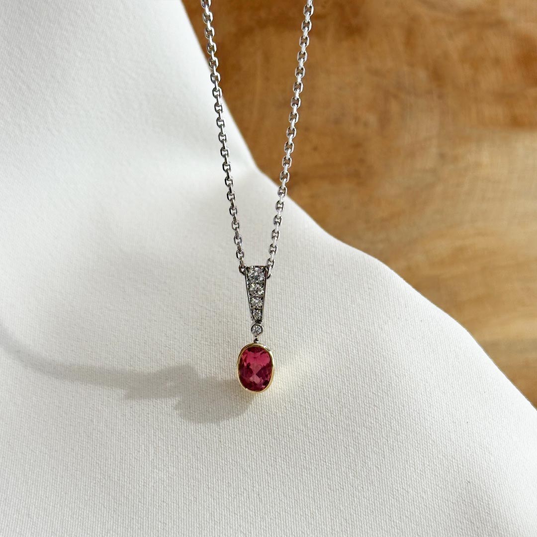Dieser handgefertigte Anhänger aus 585 Weiß- und Gelbgold verbindet klare Linien mit feinster Edelsteinfassung. Im oberen Bereich sind Brillanten in Weißgold eingefasst – dezent abgestuft im Verlauf, sodass ihr Funkeln sanft nach unten führt. Den Abschluss bildet ein ovaler rosa-rot schimmernder Turmalin, der glatt in Gelbgold eingefasst ist und durch die warme Goldfarbe besonders zur Geltung kommt. Mit einer Größe von 20mm bleibt der Anhänger zart, wirkt aber durch die harmonische Gestaltung sehr präsent. Wir empfehlen die Kombination mit einer schlichten Karree-Kette, damit das Schmuckstück seine volle Wirkung entfalten kann. Passend dazu ist auch Ohrschmuck erhältlich.$LF$LF$LF$LF$LF$LF$LF