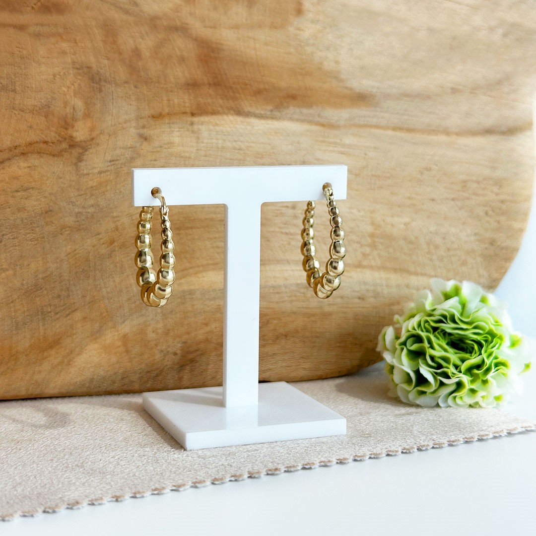 Diese modischen Creolen aus 585 Gelbgold bestechen durch ihr besonderes Design: Sie bestehen aus aneinandergereihten Goldkugeln, die den Ohrringen eine moderne und zugleich zeitlose Optik verleihen. Mit einem Durchmesser von 25mm haben sie eine ideale Größe – nicht zu klein, aber dennoch dezent genug, um vielseitig kombiniert zu werden. Durch die Kugelstruktur wirken die Creolen verspielt und elegant zugleich. Die hochwertige Verarbeitung sorgt für angenehmen Tragekomfort. Ob als modisches Highlight zu schlichten Outfits oder als Ergänzung zu weiterem Goldschmuck, diese Creolen sind ein absoluter Hingucker und passen zu jedem Stil.