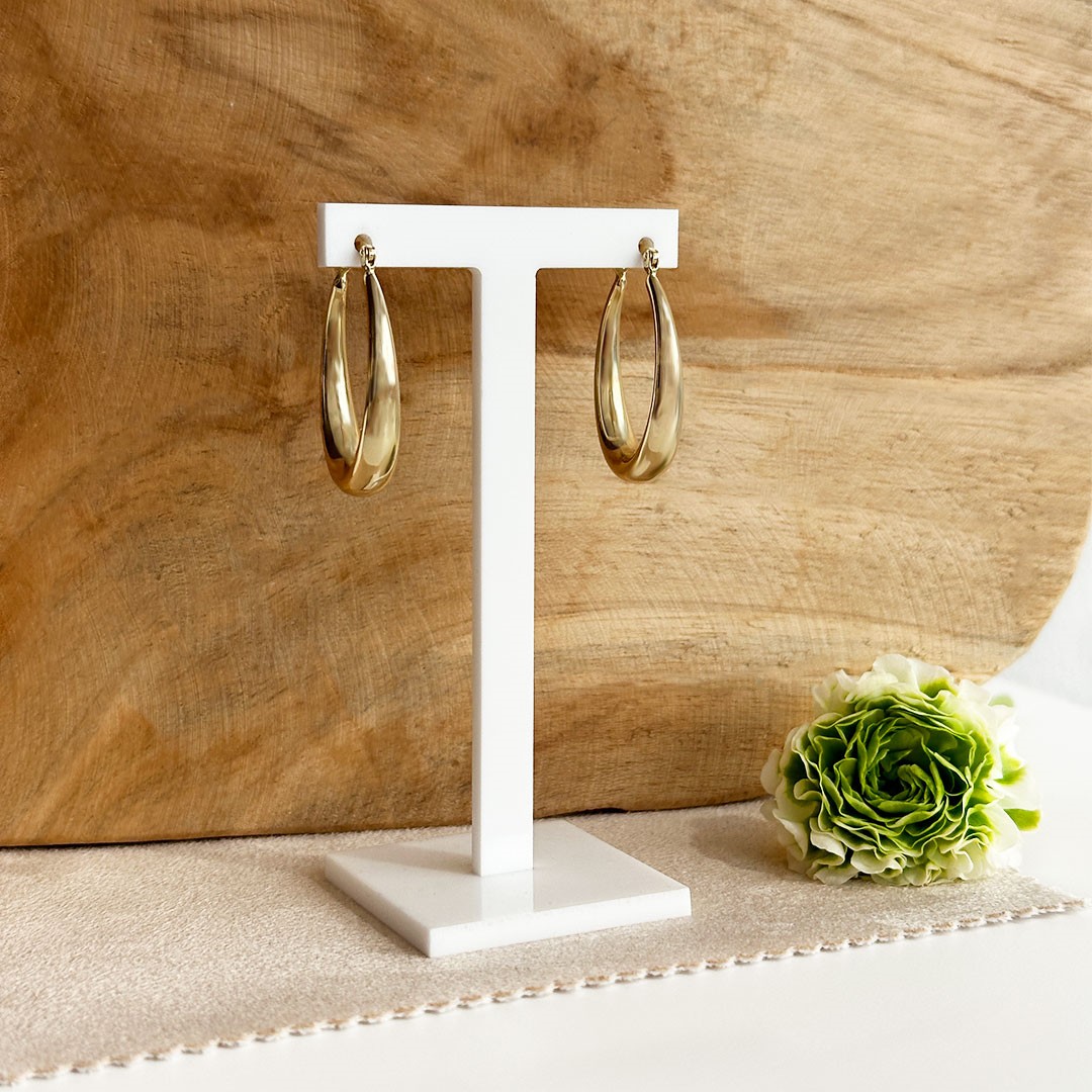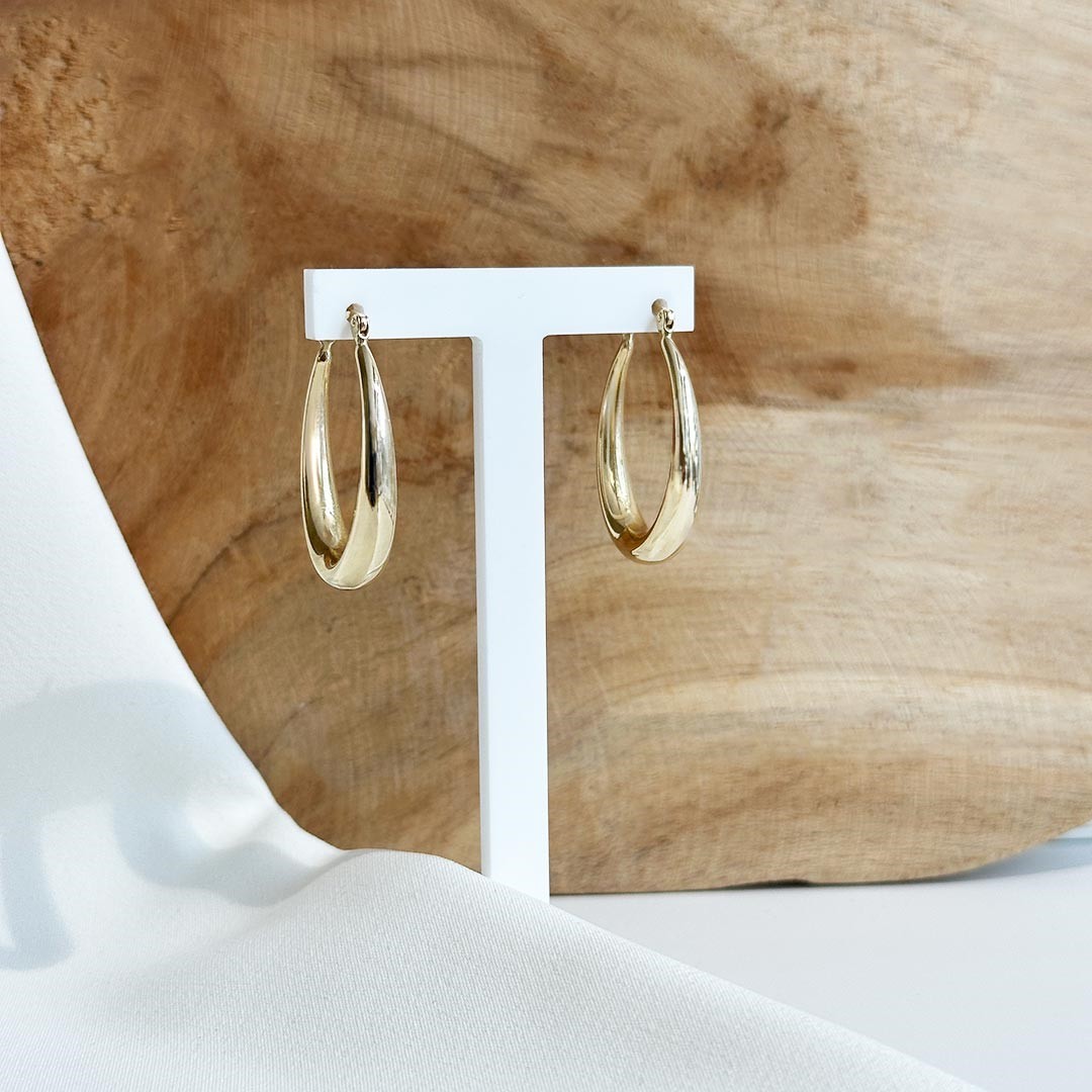 Diese eleganten Creolen aus 585 Gelbgold überzeugen mit ihrer klassischen, ovalen Form und einem sanft verlaufenden Design. Oben schmaler und nach unten hin breiter werdend, entsteht eine ausgewogene Silhouette, die dem Schmuckstück Tiefe und Präsenz verleiht. Die klaren Linien und das warme Gold schaffen eine zeitlose Eleganz, die sich mühelos zu jedem Stil kombinieren lässt. Ein stilvoller Begleiter für den Alltag und besondere Anlässe – dezent im Ausdruck, doch mit feiner Wirkung.