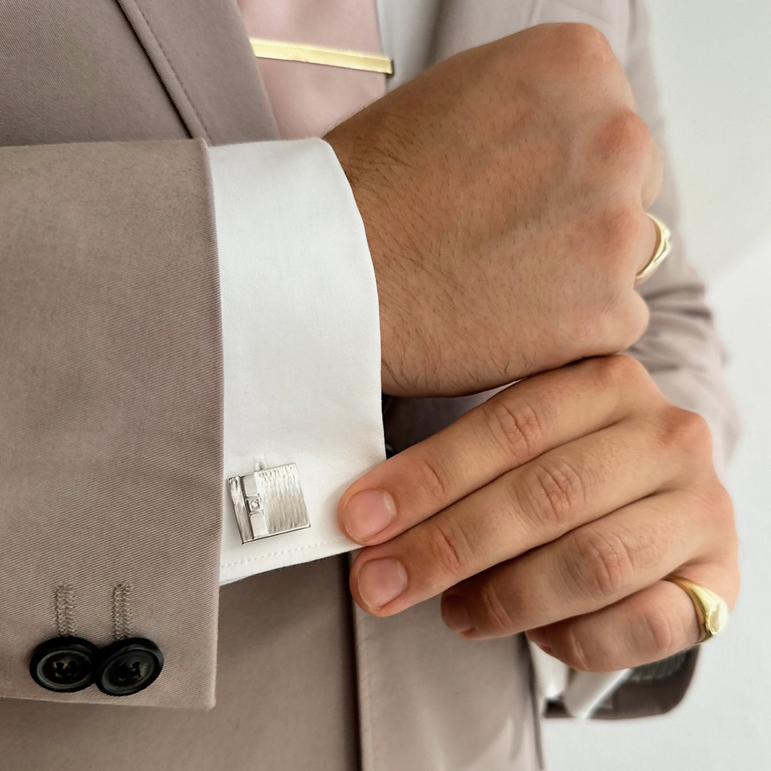 Diese Manschettenknöpfe aus Weißgold sind ein echtes Highlight. Ihre interessante Oberflächenstruktur verleiht ihnen einen einzigartigen Look. Ein funkelnder Diamant ist kunstvoll in die Manschettenknöpfe eingefasst und kommt wunderbar zur Geltung. Das klassische Design in Kombination mit der modernen Oberflächenstruktur verleiht ihnen einen zeitgemäßen Charme. Egal, ob für besondere Anlässe oder die eigene Hochzeit, diese Manschettenknöpfe passen immer perfekt. Sie sind nicht nur ein stilvoller Begleiter, sondern auch ein Schmuckstück für ein langes Leben.