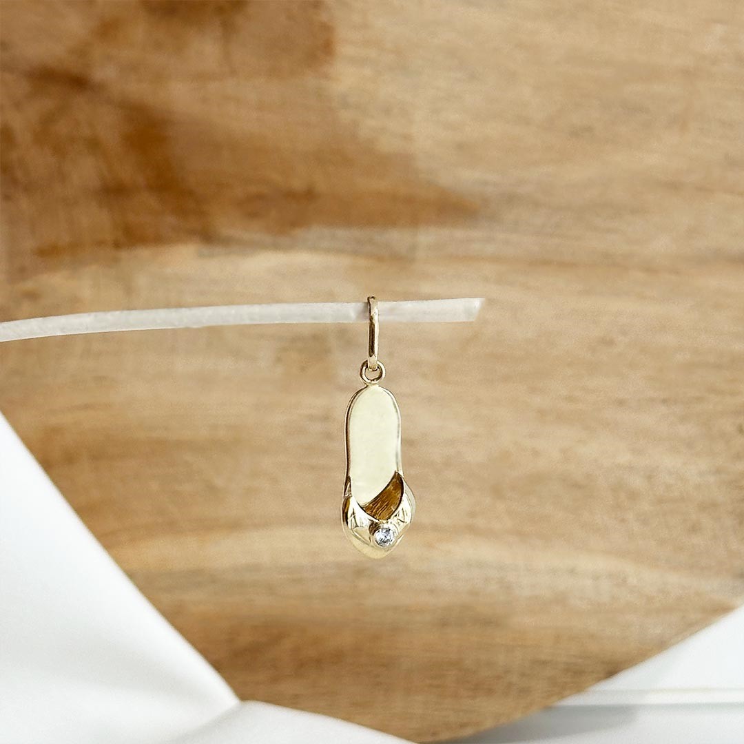 Dieser charmante Flip-Flop-Anhänger aus 585er Gelbgold bringt Urlaubsstimmung direkt ans Handgelenk. Mit einer Größe von ca. 20mm und einem funkelnden, farblosen Zirkonia im oberen Bereich erinnert er an sonnige Strandtage, warme Meeresbrisen und entspannte Momente am Wasser. Das liebevoll gestaltete Design macht ihn zu einem fröhlichen Begleiter am Bettelarmband – ideal für Reiseliebhaber*innen oder als Erinnerung an besondere Ferien. Ob als Geschenk oder als kleines Stück Fernweh für sich selbst: Dieser Anhänger sorgt garantiert für gute Laune. In unserem Sortiment finden Sie dazu eine vielfältige Auswahl an passenden Bettelarmbändern aus Gold.