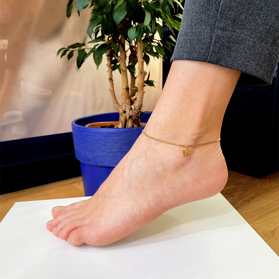 Die charmante Fußkette aus 585er Gelbgold besticht durch ihr elegantes Design in Form einer Venezianerkette – eine beliebte Standard-Goldkette. Ein zauberhafter Schmetterling-Anhänger, liebevoll in der Mitte platziert, verleiht der Kette eine verspielte und romantische Note. Mit einer Länge von 26cm schmiegt sie sich sanft um den Knöchel und fängt die Leichtigkeit des Sommers perfekt ein. Dieses Schmuckstück ist ein wunderbares Geschenk für eine lebensfrohe Frau, die das Leben in vollen Zügen genießt und die warmen Sonnentage mit stilvoller Eleganz bereichern möchte. Gerne verpacken wir das Schmuckstück passend zum Anlass.