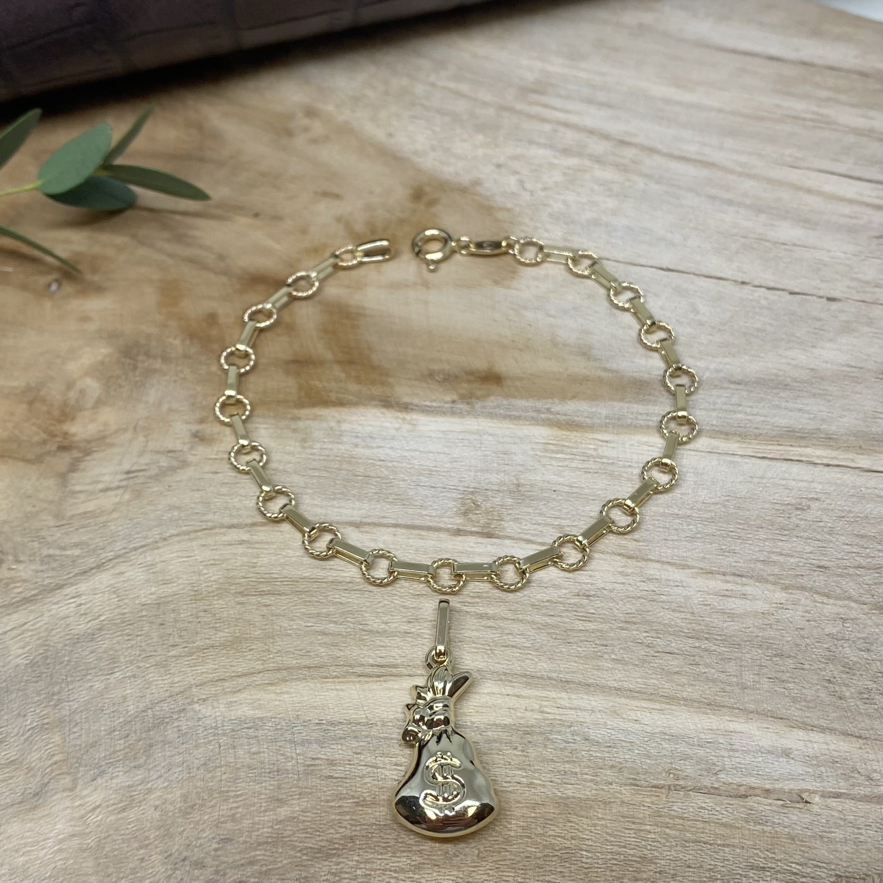 Dieser 20mm große Geldsack-Anhänger aus 585 Gelbgold steht als charmantes Glückssymbol für Wohlstand und positive Wünsche. Dank seines schlichten Designs lässt er sich problemlos an ein Bettelarmband anbringen. Ob als kleines Präsent zur bestandenen Prüfung, zum Geburtstag oder einfach als Zeichen guter Gedanken – der Anhänger bringt eine freundliche Botschaft mit sich, ohne aufdringlich zu wirken. Passende Bettelarmbänder bieten wir in verschiedenen Längen, sodass sich der Anhänger mühelos in eine persönliche Sammlung einfügt.
