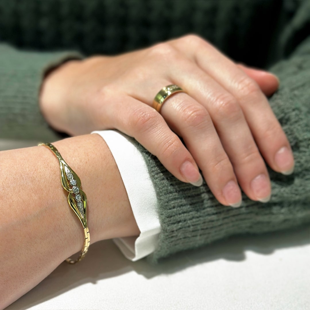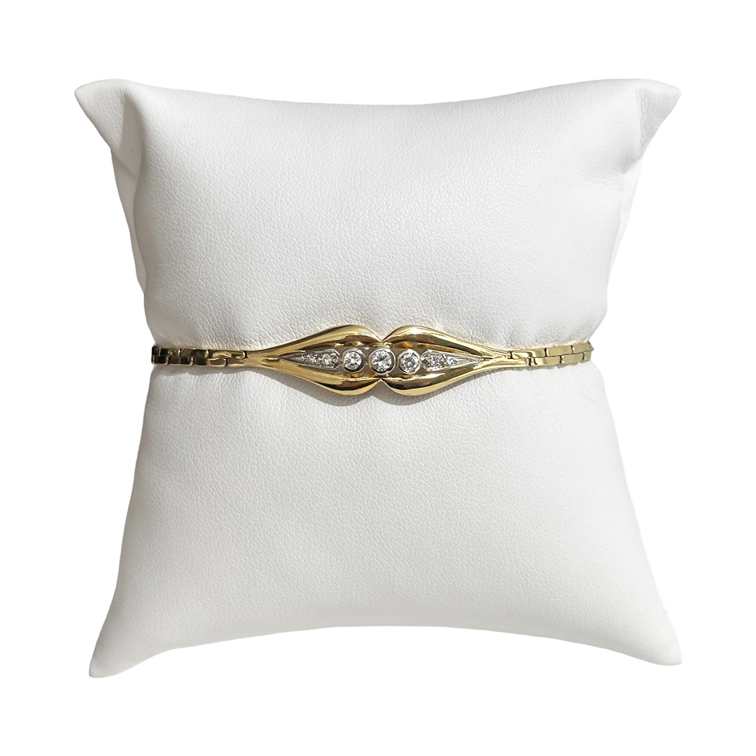 Dieses Goldarmband für Damen ist aus 750 Gelbgold gefertigt und hat eine Länge von 18cm. Im Fokus stehen die Brillanten, die in ihrer Weißgoldfassung alle Blicke auf sich ziehen. Das Armband vereint die warme Goldfarbe mit dem strahlenden Glanz der Diamanten und eignet sich somit wunderbar für besondere Anlässe. Kombinieren Sie das Armband mit weiteren Brillant Schmuckstücken aus unserem Sortiment, wie beispielsweise klassischen Brillantohrsteckern, einem passenden Goldring oder auch mit einer Perlenkette. Wir freuen uns darauf, Ihnen verschiedene Kombinationsmöglichkeiten zu präsentieren.